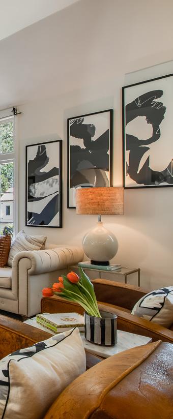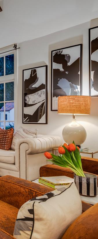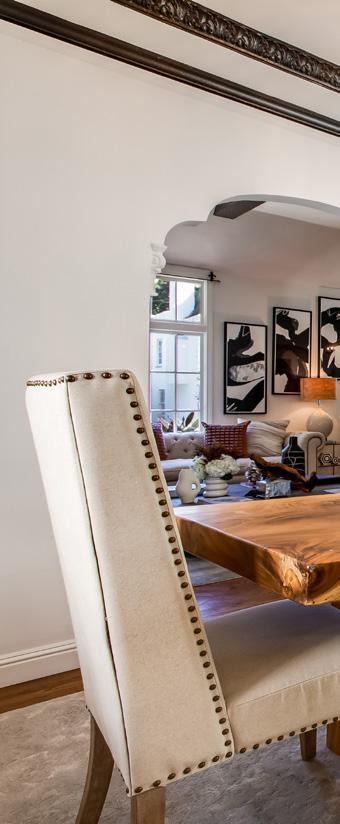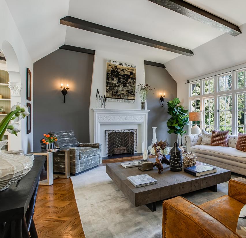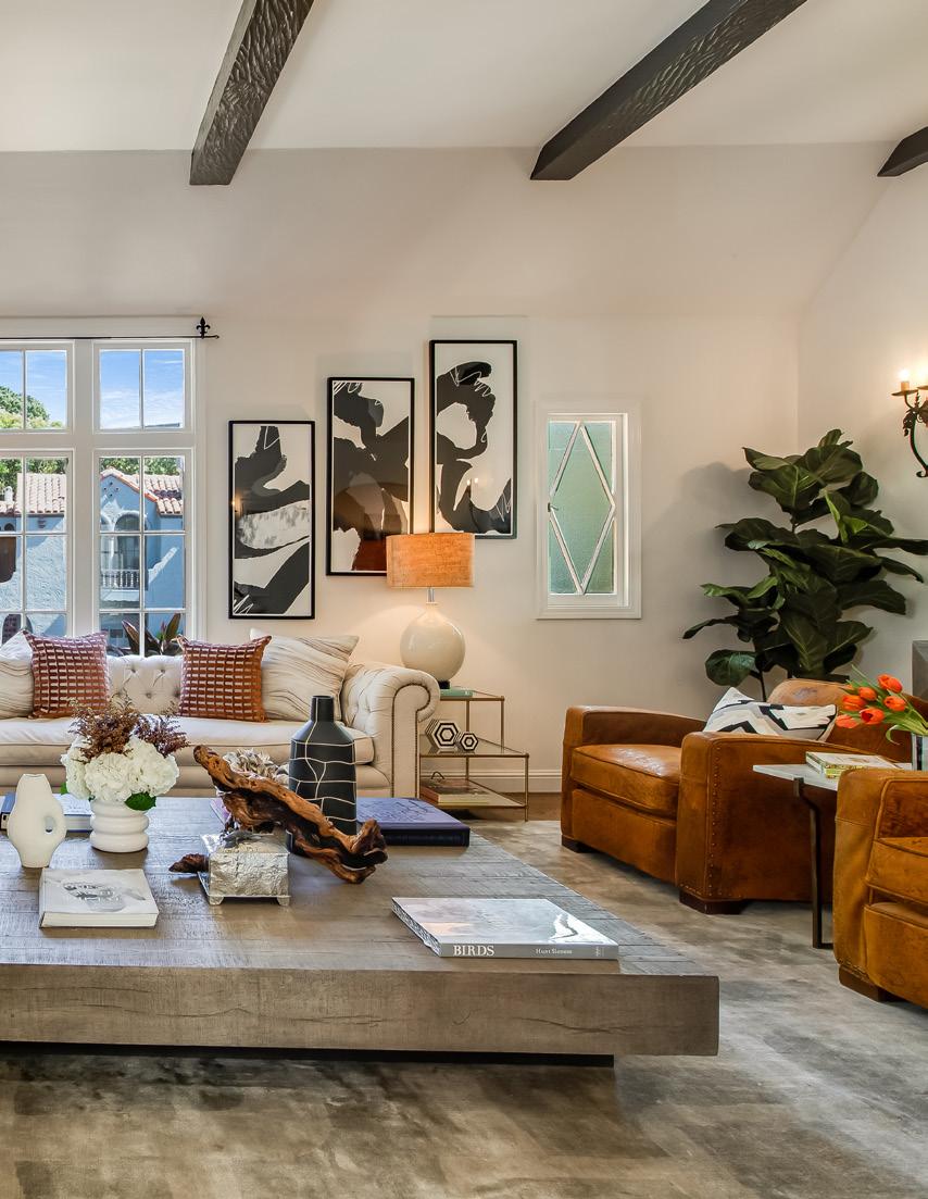 • Spacious Formal Living Room with Exposed Beamed Ceilings, Floor-toCeiling Windows, and Juliet Balcony Overlooking Landscaped Garden