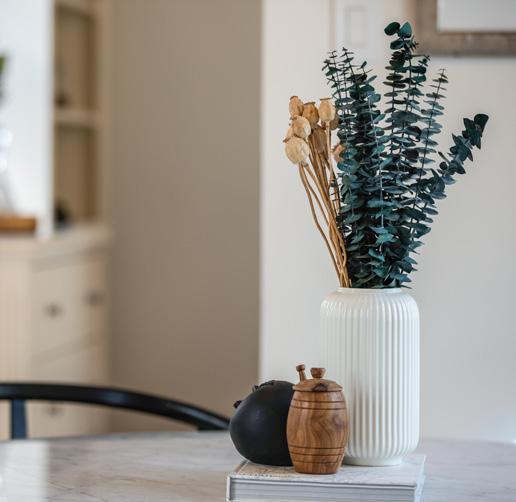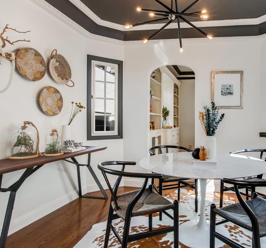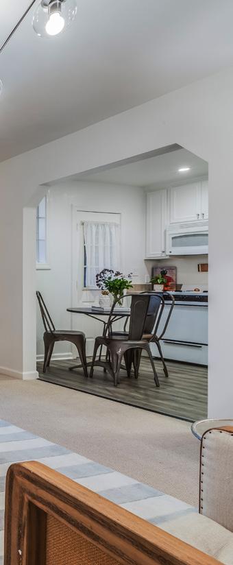 Formal dining with custom-built hutch leads to a charming breakfast room, pristine custom kitchen with new stainless appliances, quartz counters, glass fronted cabinets, and plenty of storage, and the center patio, creating a lantern-like glow throughout the home.