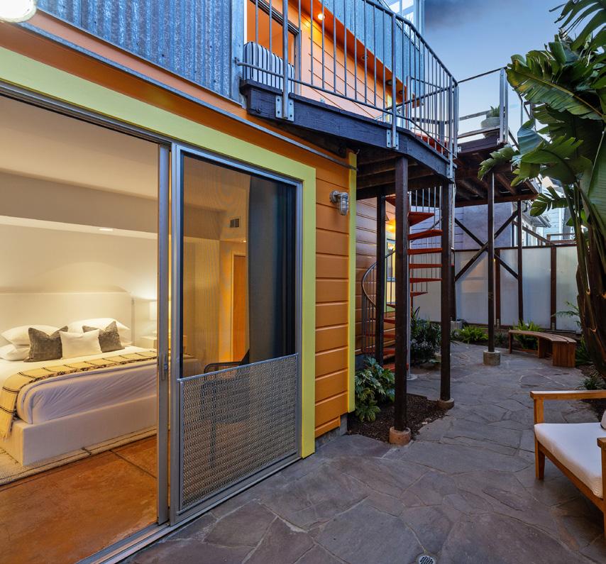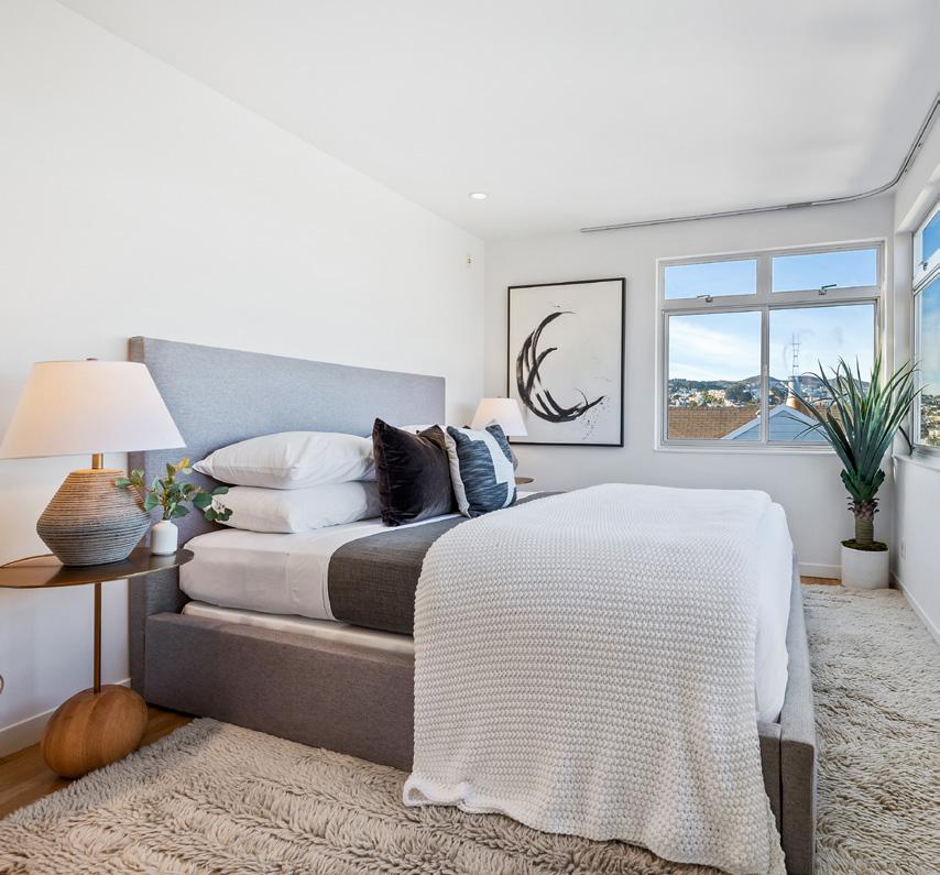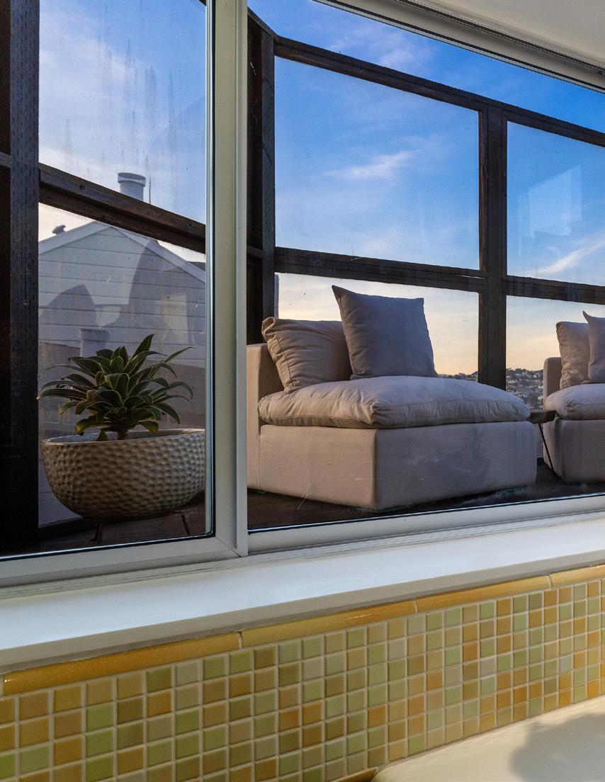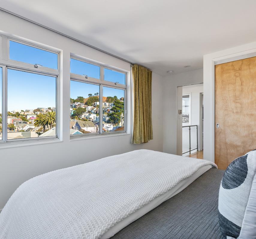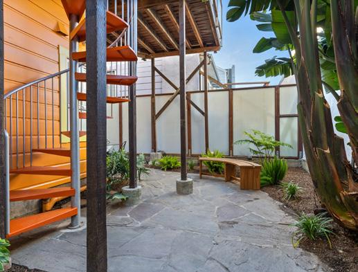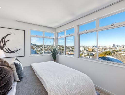 Projected into the sky, with the prominent west slope site capturing glorious light, the custom architecture is informed by lofty modernity, expanded and redesigned in the 1990s. An inventive design combines spectacular city views, open plan living, and indoor-outdoor livability. Embraced by its artful, exotic garden, the three-bedroom, onebath, two-level home plus legal one-bedroom, one-bath unit opens to an expansive view deck and a shared patio. Panoramic views include downtown, Twin Peaks, and sunny Bernal Hills.