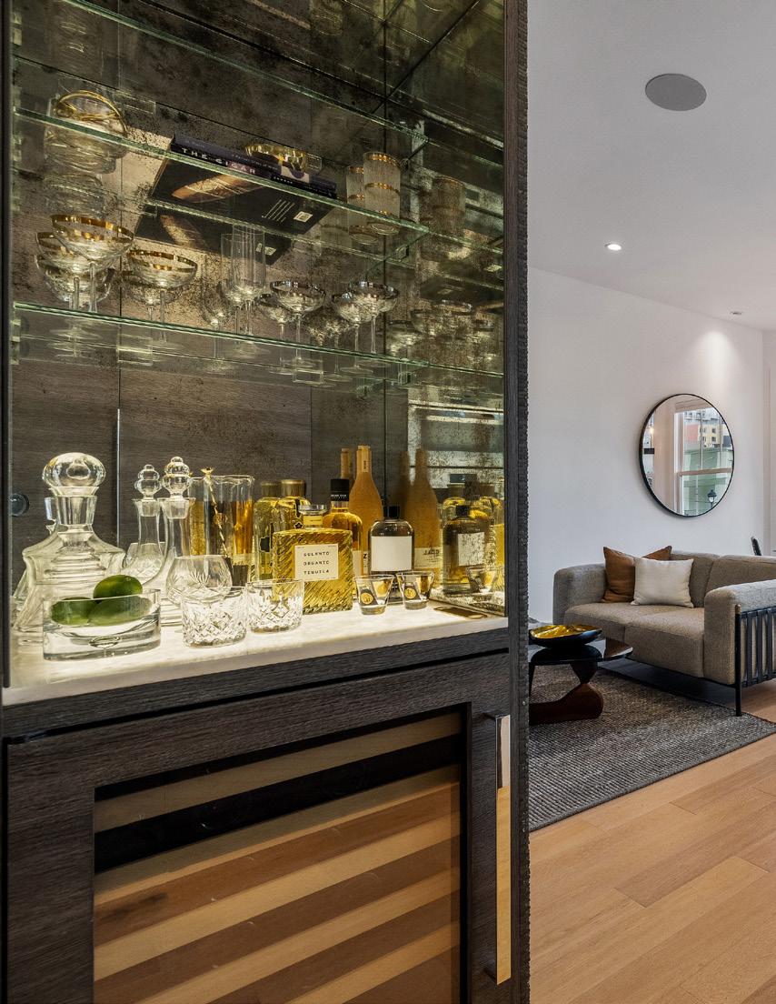 In the impressive upper level, used as a richly articulated home, the bespoke environment marries views, light, and air with artisanal walnut millwork, gorgeous stone, masterful storage solutions, and playful, easy living design.