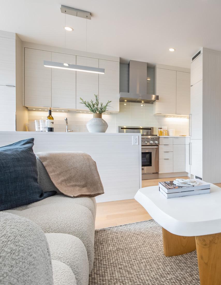 The lower level features integrated living, dining, and professionally equipped kitchen. Custom library, high ceilings, well-articulated closets, and in-unit laundry (two potential locations), set the tone for pristine comfort, useful as office, guest, or rental.