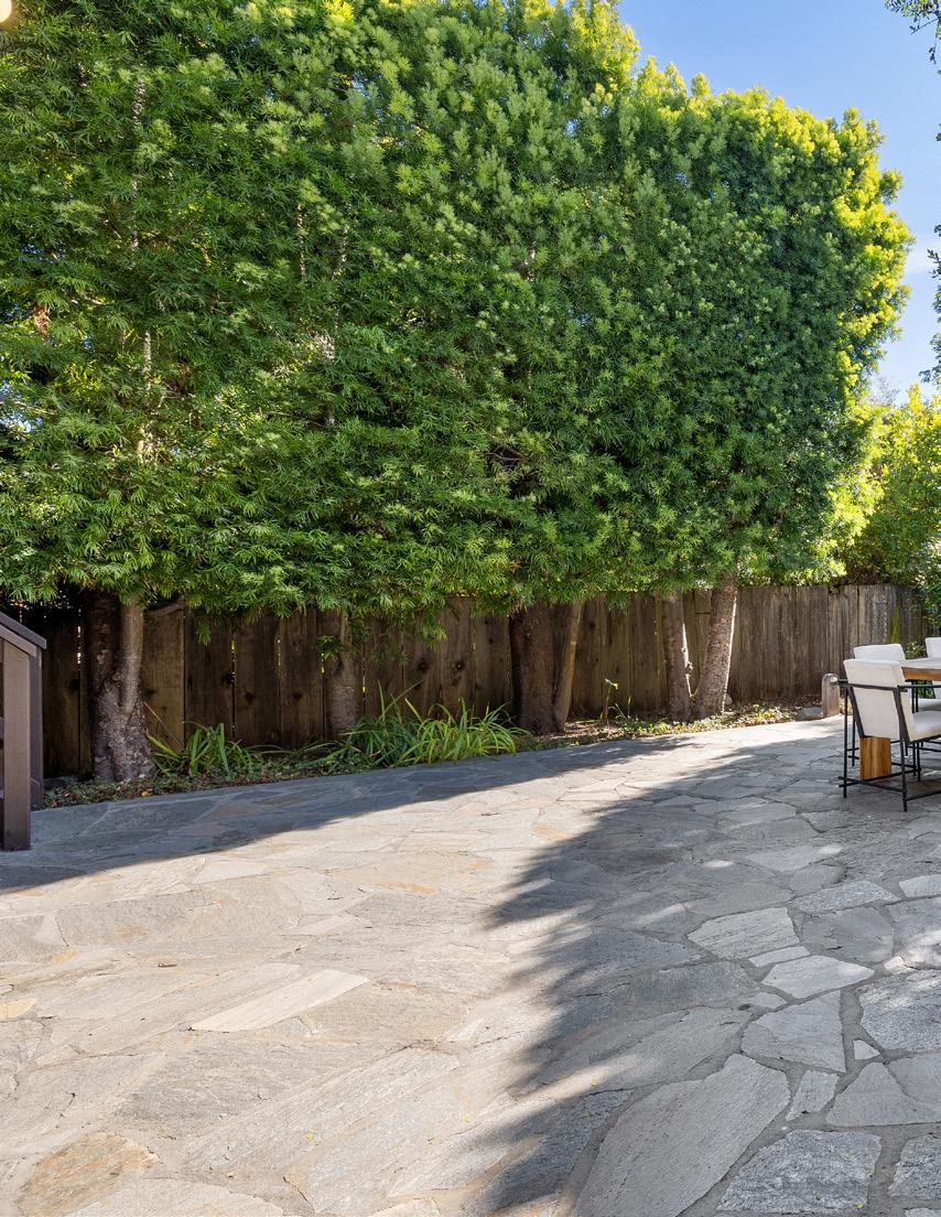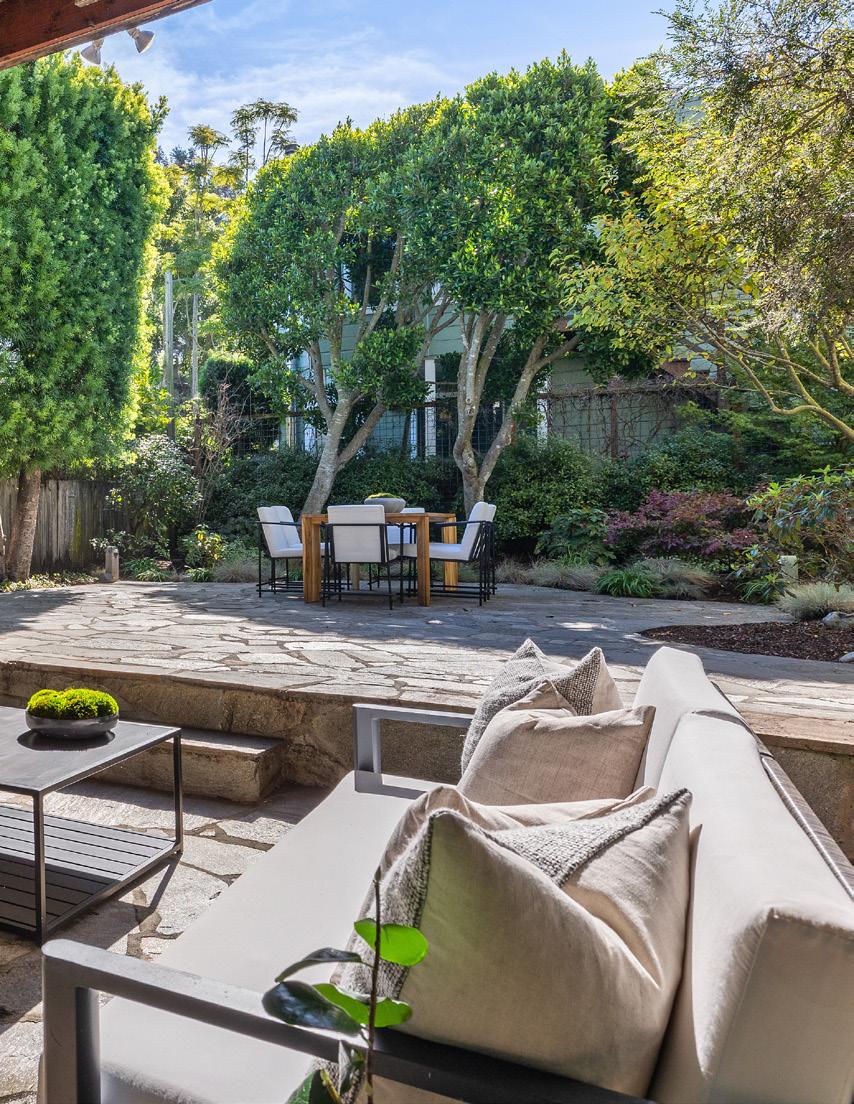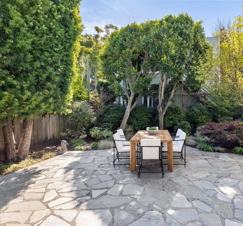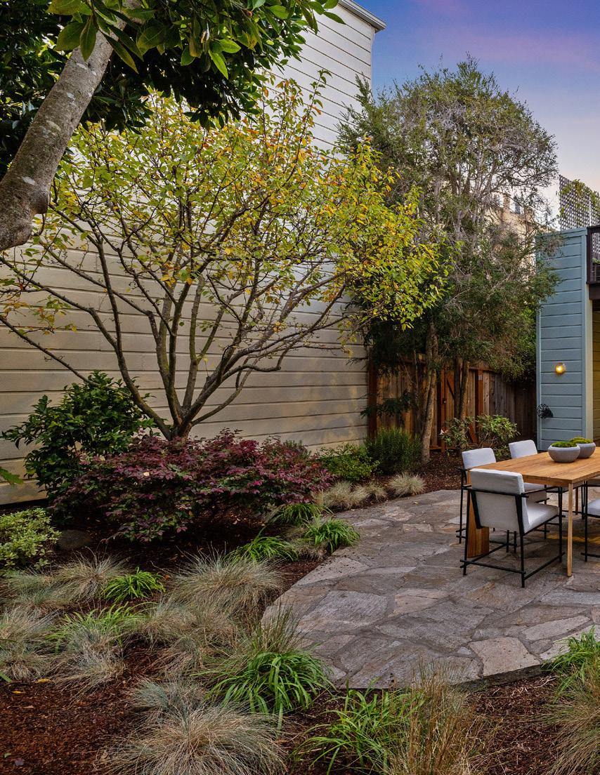 Deep and wide, the mature Asian-inspired garden and slate patio are sheltered and serene: true outdoor living rooms.