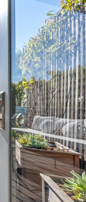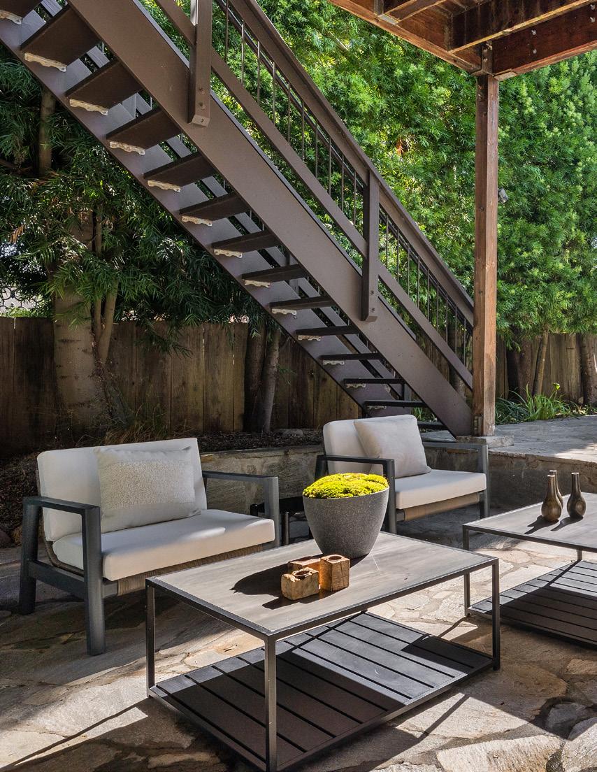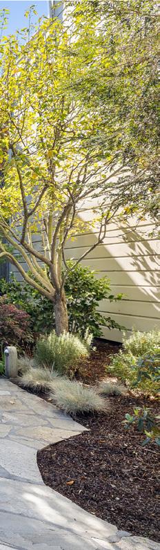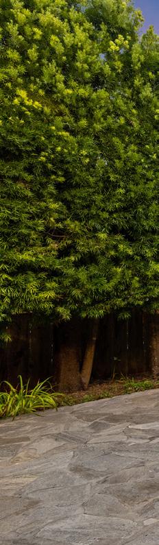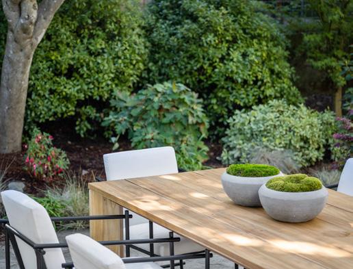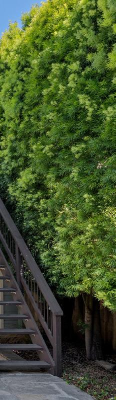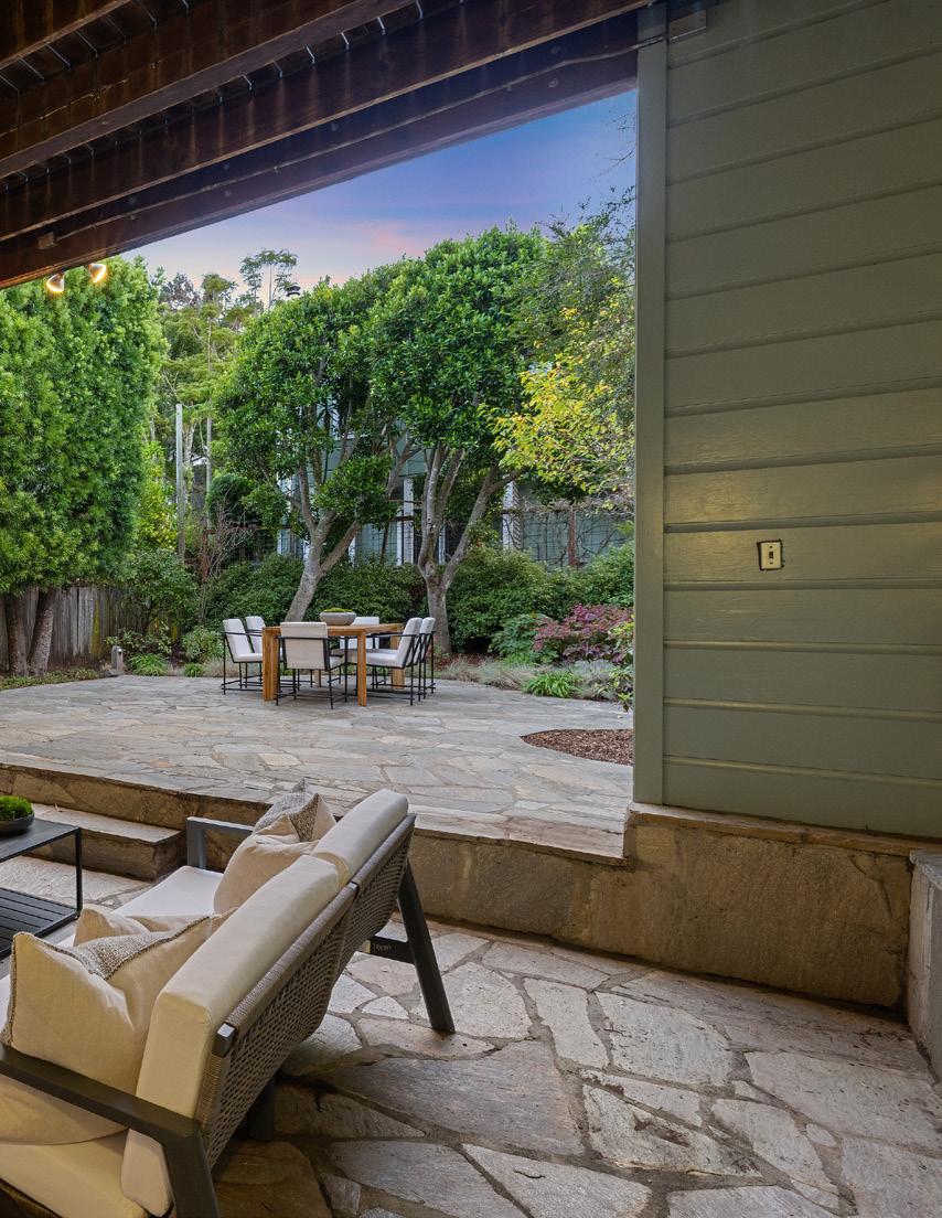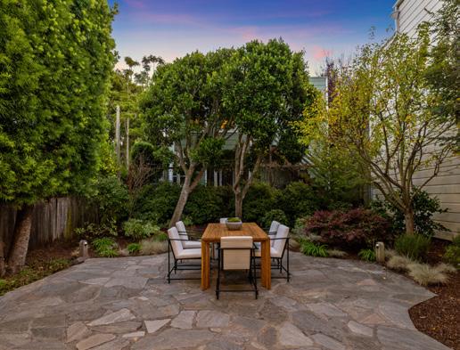 Deep and wide, the mature Asian-inspired garden and slate patio are sheltered and serene: true outdoor living rooms.