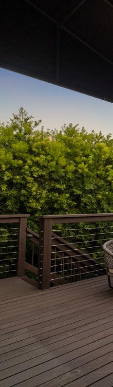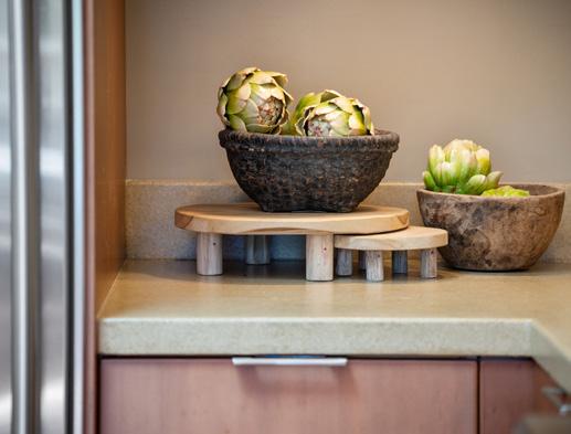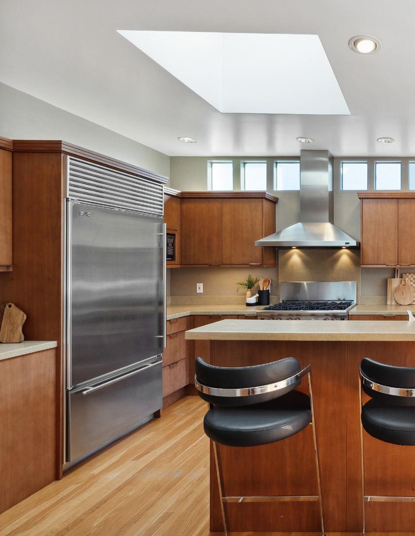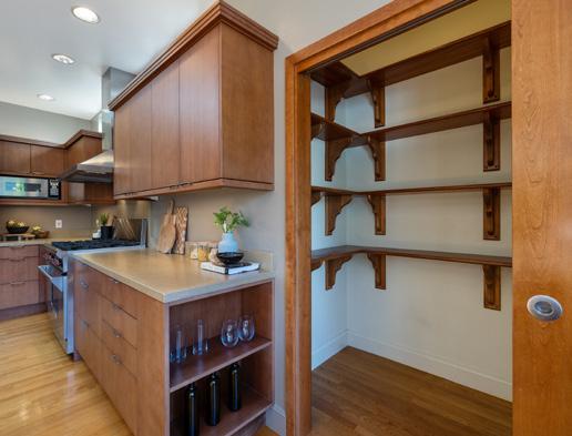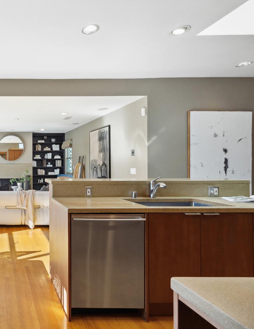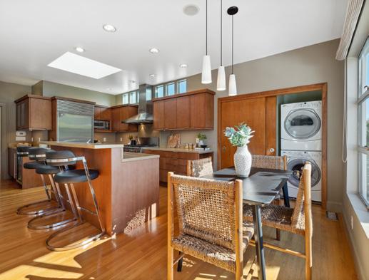 The grand-scale, eat-in kitchen with professional culinary appointments, custom cabinetry, huge pantry/laundry, and concrete counters by Buddy Rhodes is as hardworking as it is beautiful. This space embraces a lovely family room with wood-burning fireplace, open to the massive south-facing deck.
