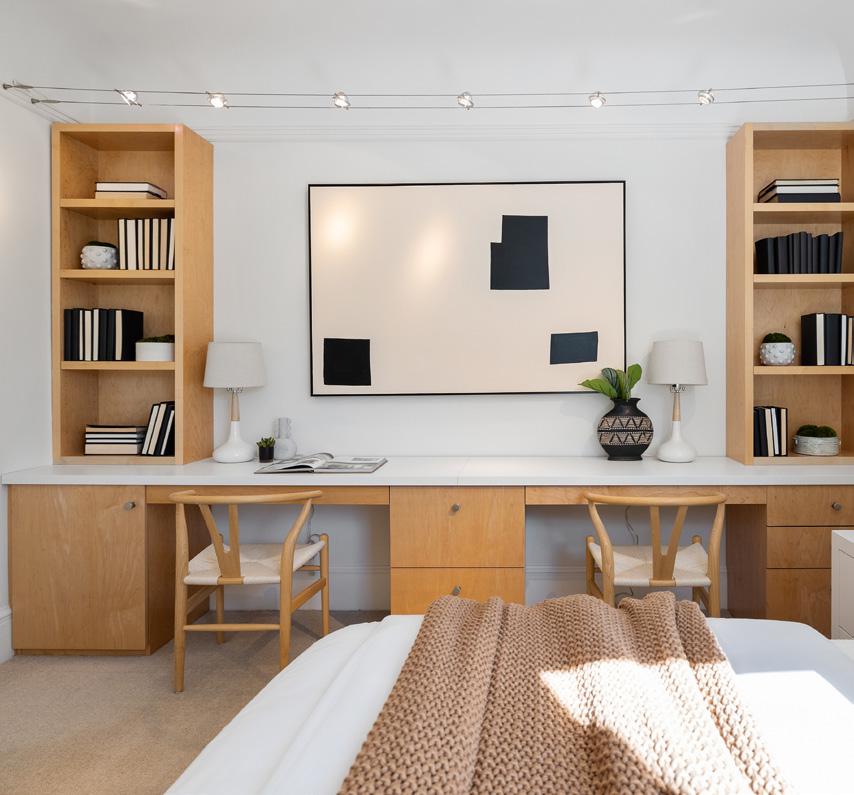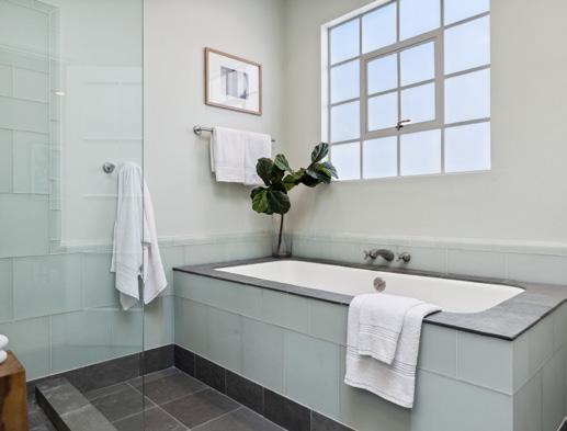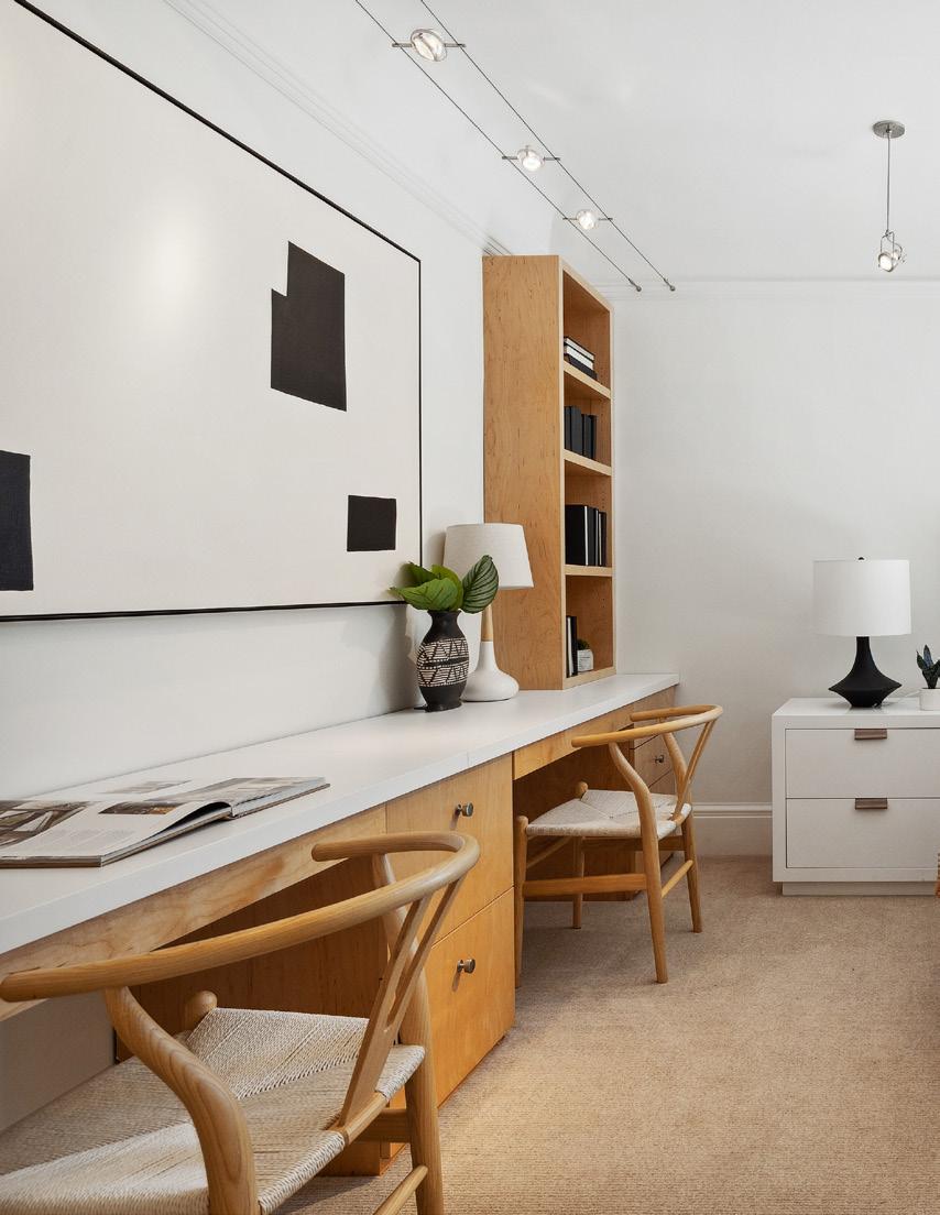 Two bedrooms are set in the heart of the home, the primary suite comprised of a beautifully appointed sky-lit bath with deep soaking tub, spacious shower, dual sinks, and custom window coverings. The guest room is fitted with a sleek office for ultimate flexibility. A handsome European style marble bath serves as a powder room and guest bath.