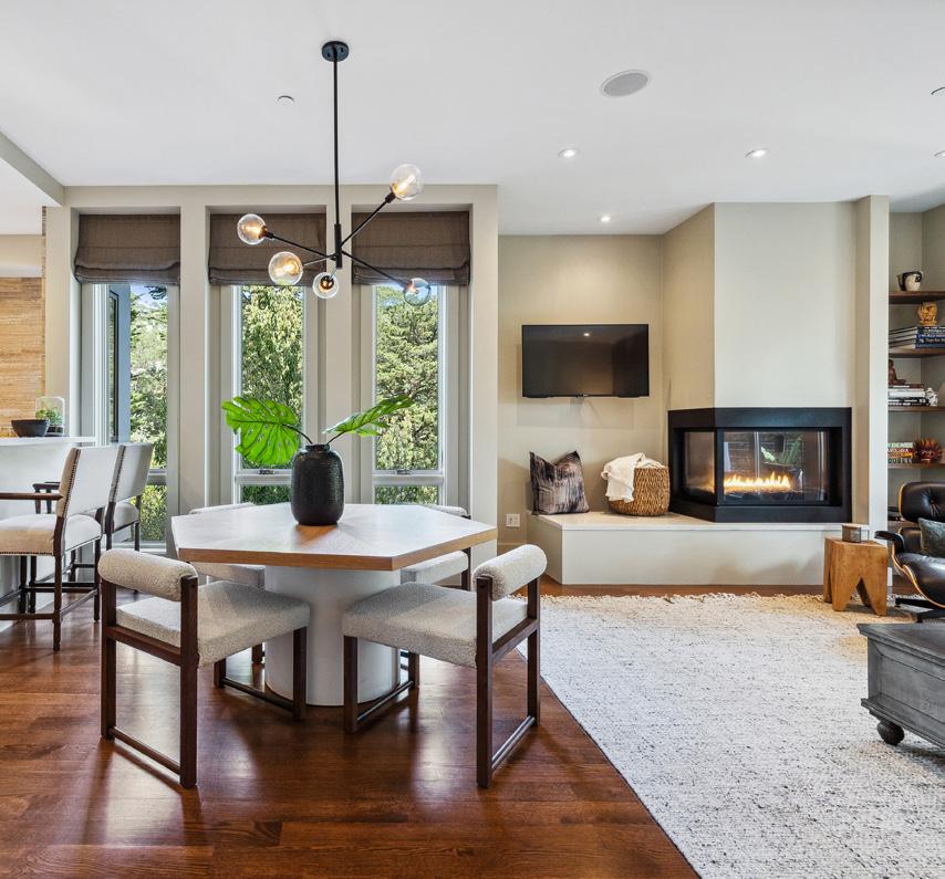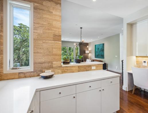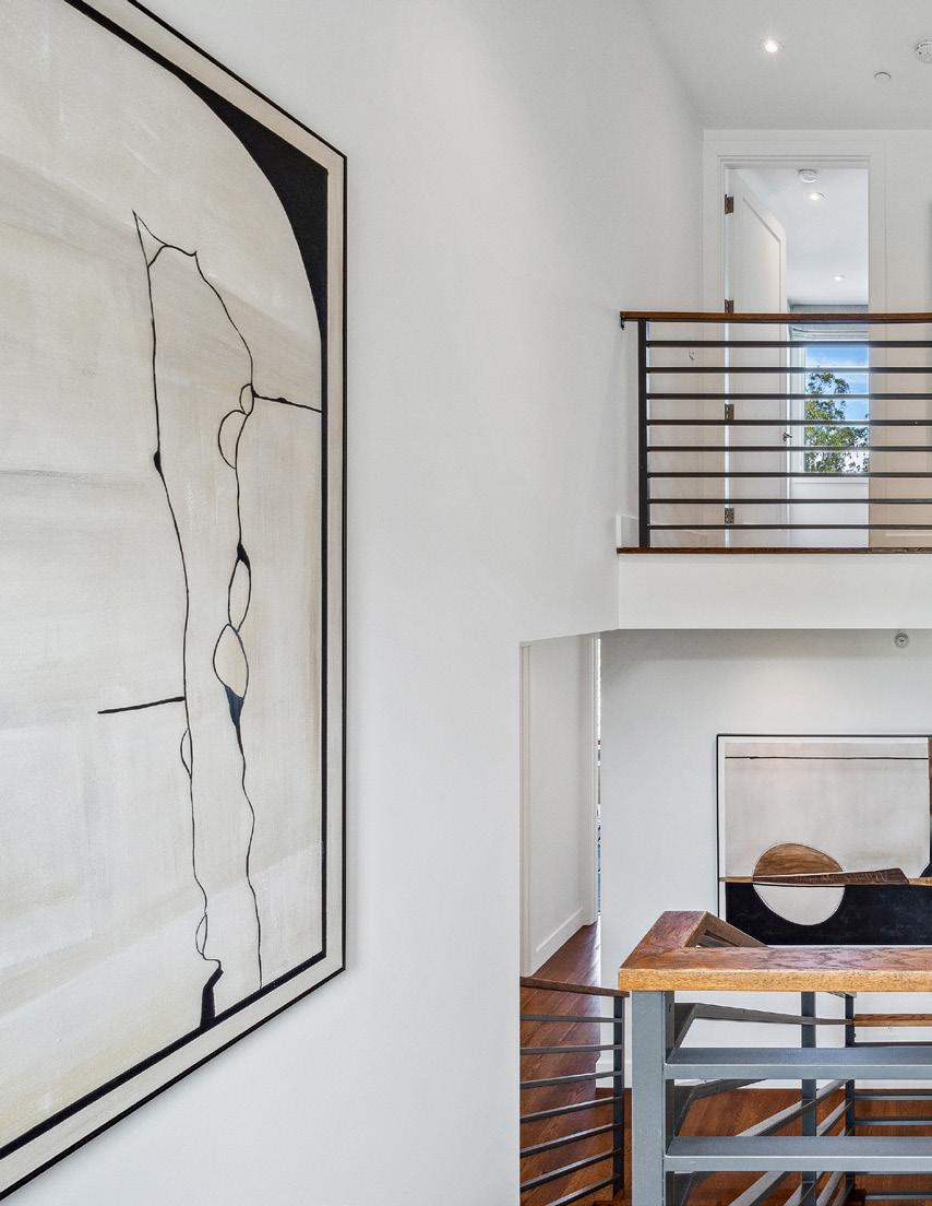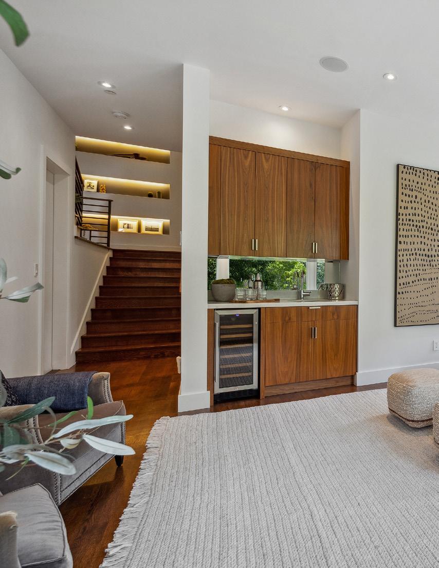 The open plan of the main level comes alive with soaring ceilings, sleek custom kitchen, and floorto-ceiling windows open to a canyon view terrace. A powder room and fireplace complete this level.