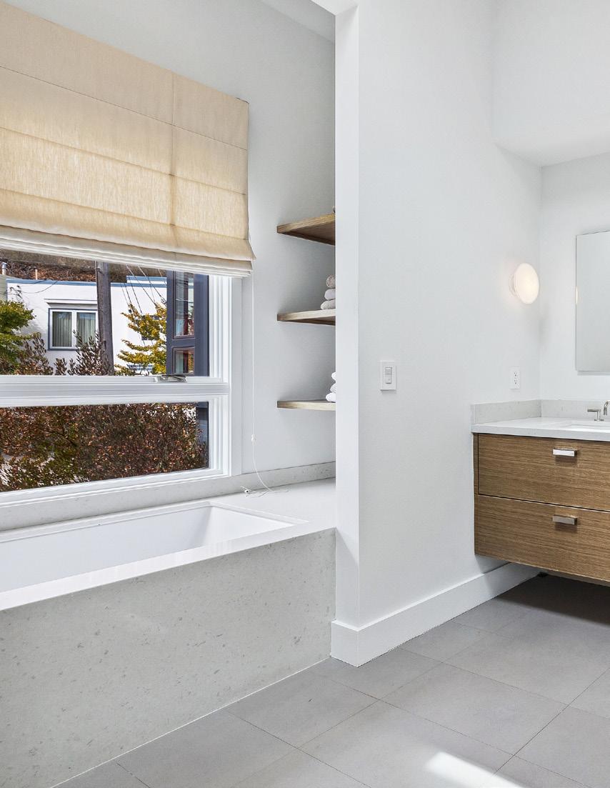 An impressive full-floor penthouse suite is embraced by a luxurious spa-like bath with double sinks, soaking tub, and rain shower, and it also includes a custom closet, office, and a spacious private deck.
