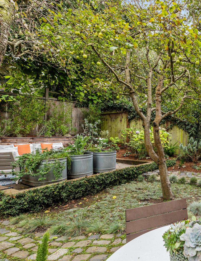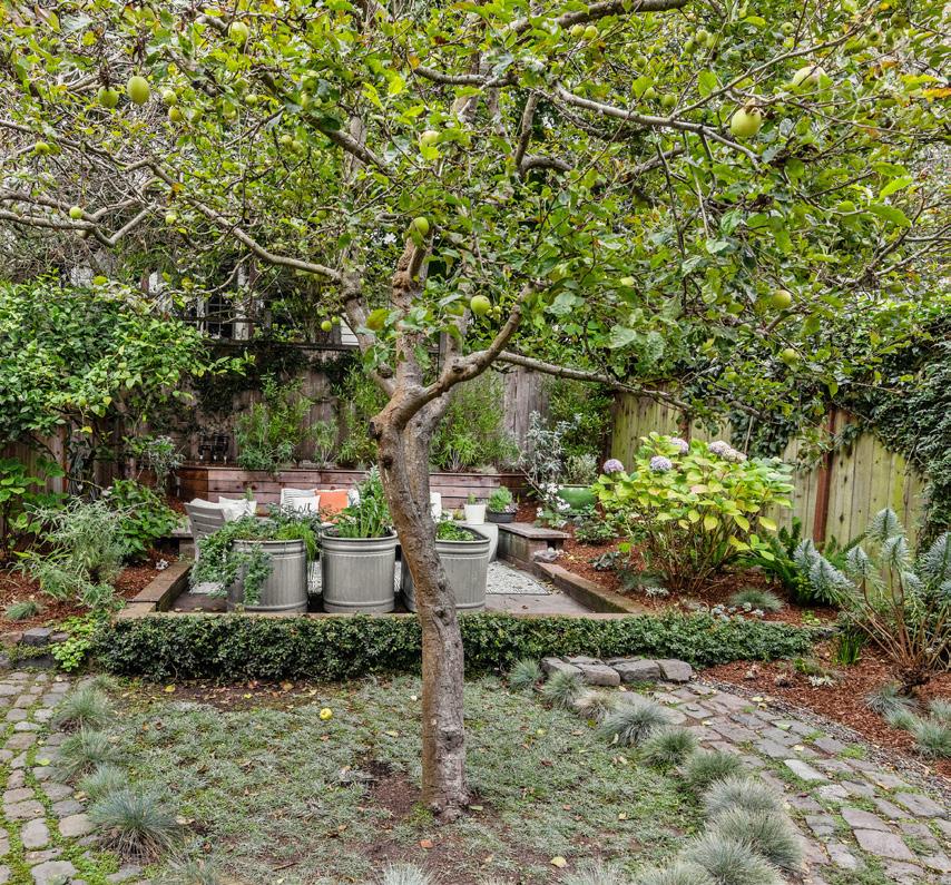 Fruiting apple tree, fragrant herbs, and culinary plantings are embraced by custom seating and a cobblestone Par Terre in the garden, equally charming as they are useful.