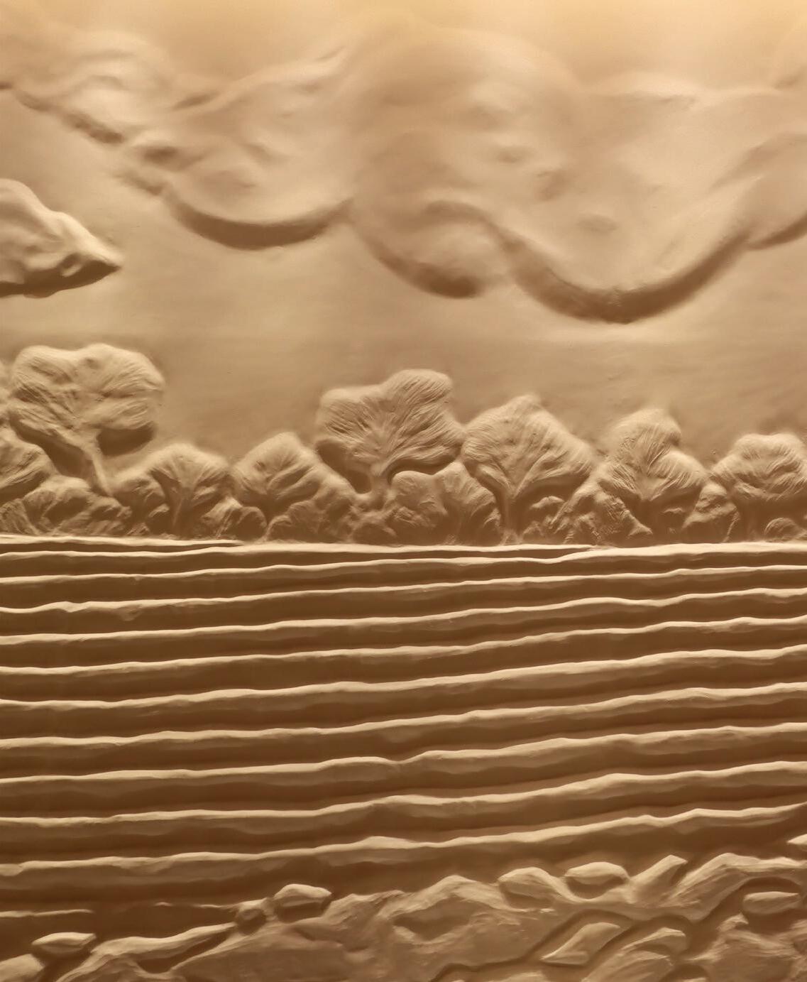 On the east niche of the tower is a figure representing produce, with an ox drawing a chariot. A winged female figure representing ‘The Triumph of Agriculture,’ stands on the chariot with a flaming torch in her hand. In front of these, a figure signifying husbandry leads the oxen equipped with agricultural implements.