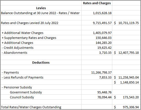 Rates and Charges collections for the month of May 2023 were $1,192,712.43. After allowing for pensioner subsidies, the total levies collected are now 87.44%. For comparison purposes 88.96% of the levy had been collected at the end of May 2022. Council currently has $47,380,021.25 in cash and investments.