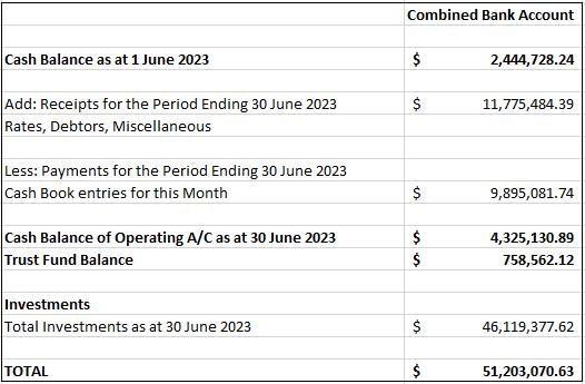As at 31 May 2023 Council had $42 million invested in term deposits and $5,380,021.25 in other cash investments. Council received $68,137.67 from its investments for the month of May 2023.