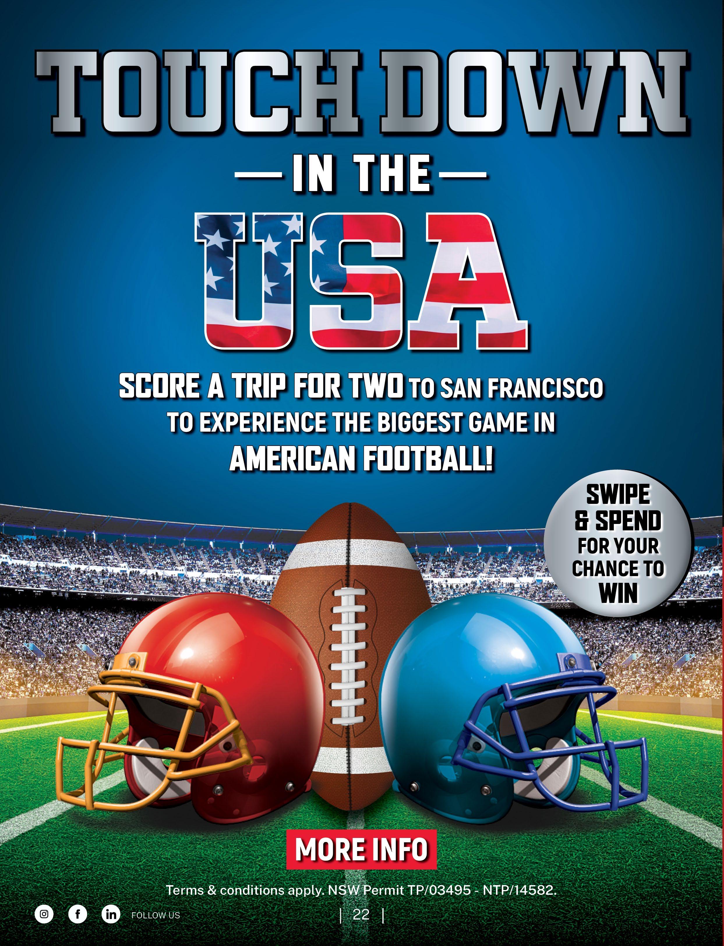 There’s a real buzz around the club with our Touchdown in the USA promotion in full swing. One lucky member will win a oncein-a-lifetime trip to the Super Bowl in San Francisco, and the energy will be electric at the major draw on Sunday, November 24. We encourage everyone to join us for what promises to be a standout out.