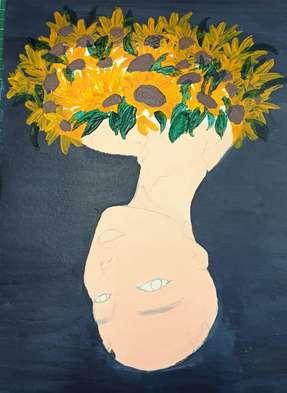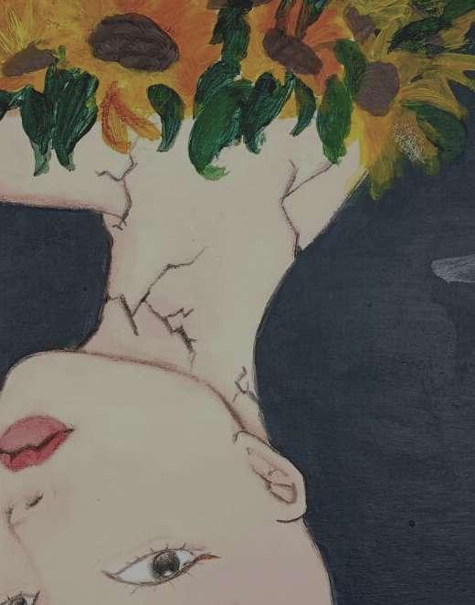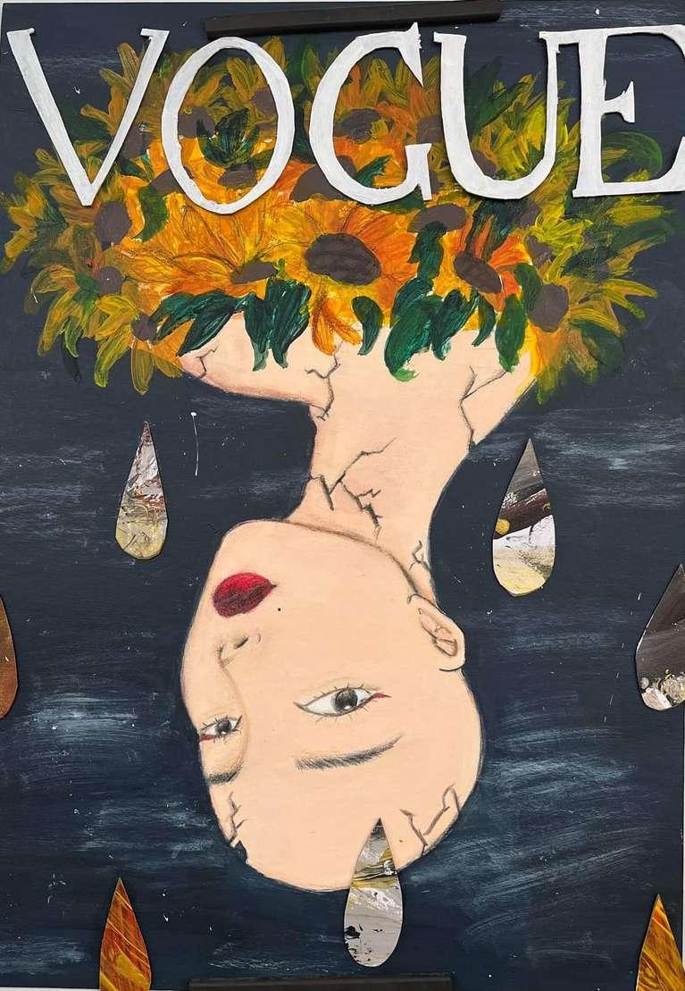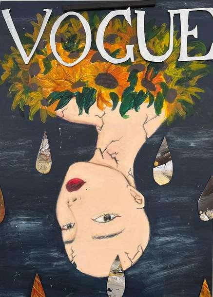 作品 作為主題的VOGUE字樣厚紙另貼⽽成製⽴ ⽽⽩⾊克⼒顏則是字樣凸顯出來⾊景做 景的質同樣利⽤⽩⾊克⼒顏使景看來 不顯的顯得單裝的滴由質⾊紙拼貼另 使⽤厚紙作產⽣⽴ 上下顛倒的「⼈」對世界的不到憤恨卻⼜ 為⼒它的下是⼀個陶載盛開的向⽇⽽ 向⽇⼀給⼈正向明的同⼀被社會打擊 卻依站來的我們⼀樣不願意輕易被擊倒⼦上的痕 是被摔打留下的傷痕但它並不碎仍頑強的維 原本的型