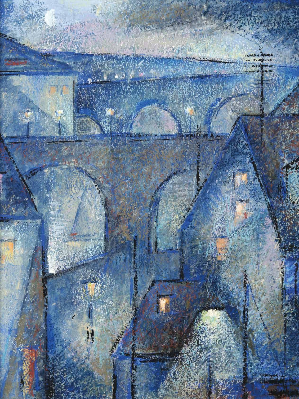 Bild: Hans Dürr, Dämmerung bei den Brücken, 1973 Tempera, Kreide auf Presspanplatte, 60 x 48 cm