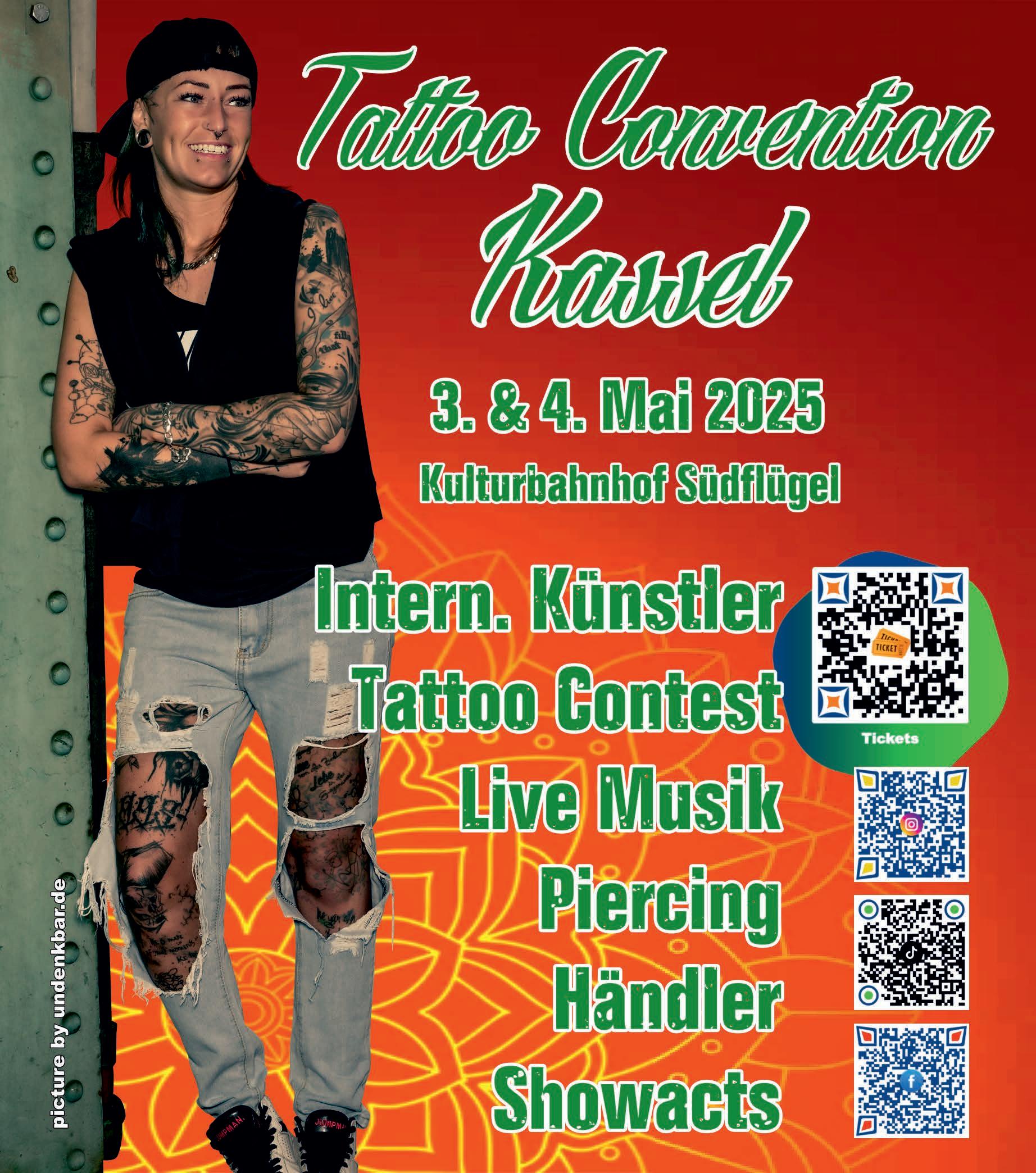 Am 3. & 4. Mai 2025 geht die Tattoo Convention Kassel im „Kulturbahnhof Südflügel“ in die nächste Runde. Die Besucher können sich auf über 50 Tattoo-Studios mit mehr als 100 Tattoo Artists aus dem In- und Ausland, Informationen über die neuesten Trends aus der Tattoo-und Piercing-Szene, ein buntes Rahmenprogramm mit Live Musik und spektakulären Show-Acts sowie einige Überraschungen freuen. Im umfangreichen Rahmenprogramm präsentieren u. a. „Stevie X“ eine musikalischen Reise durch die größten Hits von den 60er Jahren bis heute sowie „Bernd Hack“ mit seinen Gitarre Highlights aus sieben Jahrzehnten Unterhaltungsmusik. Außerdem können sich die Besucher auf Pole-Dance-Akrobatik mit „Èowyn“ freuen. Zahlreiche Tattoo Contests in verschiedenen Kategorien vervollständigen das Angebot. Moderation: Daniel Rust vom Bundesverband Tattoo e. V. und TikTok-Star Caro Litsches