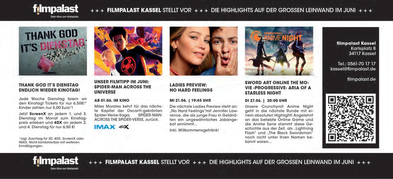 Am 01. Juli 2023 präsentiert der Hauptfriedhof Kassel einen „Tag der offenen Tür“ als „Tag des Films“. Die Mitarbeiterschaft organisiert dieses Event. Der Tag beginnt mit unterschiedlichen Führungen ab 13.00 Uhr auf dem Hauptfriedhof und setzt sich fort mit ersten kleineren Filmen im Innen- und Außenbereich ab 18.00 Uhr. Die Bevölkerung Kassels und des Umlandes ist recht herzlich eingeladen. Als Hauptfilm ist ab 22.00 Uhr die Komödie „Yesterday“ (2019) mit den Songs der Beatles angesetzt, deren Lieder vergessen wurden. Auch für Kinder ist im Vorprogramm etwas dabei. Die Liebhaber guter Musik von Spohr dürfen sich auf einen preisgekrönten Film freuen. Für das leibliche Wohl ist gesorgt. ›› www.friedhofsverwaltung-kassel.de
