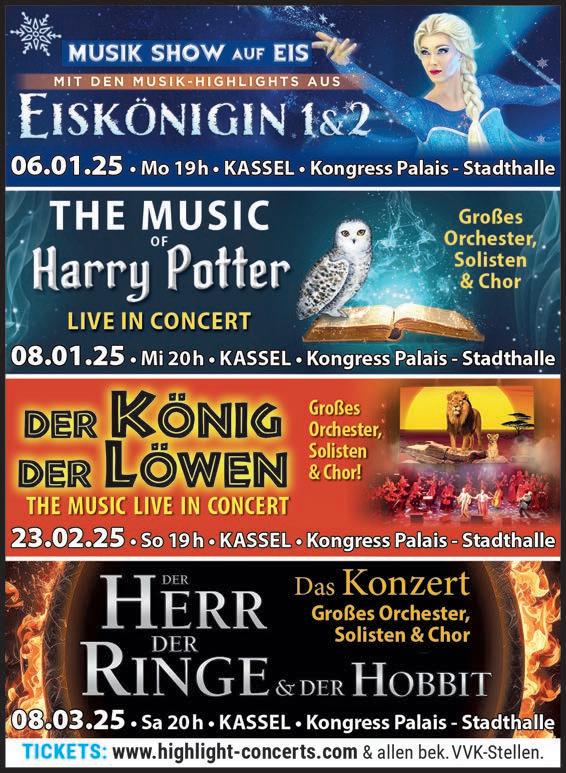 Atze Schröder: „Der Erlöser“, Lichterfest in Wilhelmshöhe, Kasseler Jazzfest, Die Drei von der Tankstelle, Das Schnupper-Abo ist wieder da!, Kabarett-Theater DISTEL: Wer hat an der Welt gedreht, Frieda Braun: Auf ganzer Linie, Christoph Sieber: Weitermachen, Der kleine Drache Kokosnuss, DIE ZEITREISE, Nicole Jukic & Frank Sommerfeld: Perlen der Popmusik, The Groove Juice Christmas Jazz, Teil der Musik, Musik zum Teilen, Vom Himmel schneit es kalte Sterne, 47. Göttinger Jazzfestival.