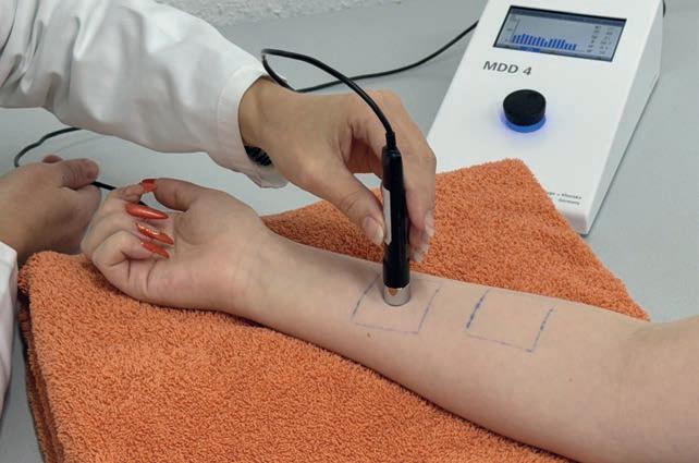 Rein wissenschaftlich betrachtet basiert die Messung der Hautfeuchtigkeit mittels der „kapazitiven Methode“ auf den sehr unterschiedlichen Dielektrizitätskonstanten von Wasser und anderen Biomolekülen. So kann der Feuchtigkeitsgehalt der Haut reproduzierbar gemessen werden. Das von Dr. Karlheinz Schrader in den 1970er Jahren entwickelte Gerät zur Bestimmung der Hautfeuchtigkeit (Corneometer) ist bis heute weltweit im Einsatz. Nicht nur in der Vergangenheit wurden bei den Instituten Prüfverfahren entwickelt. Auch in diesem Jahr konnte eine neue, alternative Methode zur Messung der Wirksamkeit von Sonnenschutzprodukten implementiert und nach ISO zertifiziert werden. All die zahlreichen Routineprüfungen von Kosmetika in den Instituten wären ohne die vielen freiwilligen Testpersonen, auch Probanden genannt, nicht möglich!