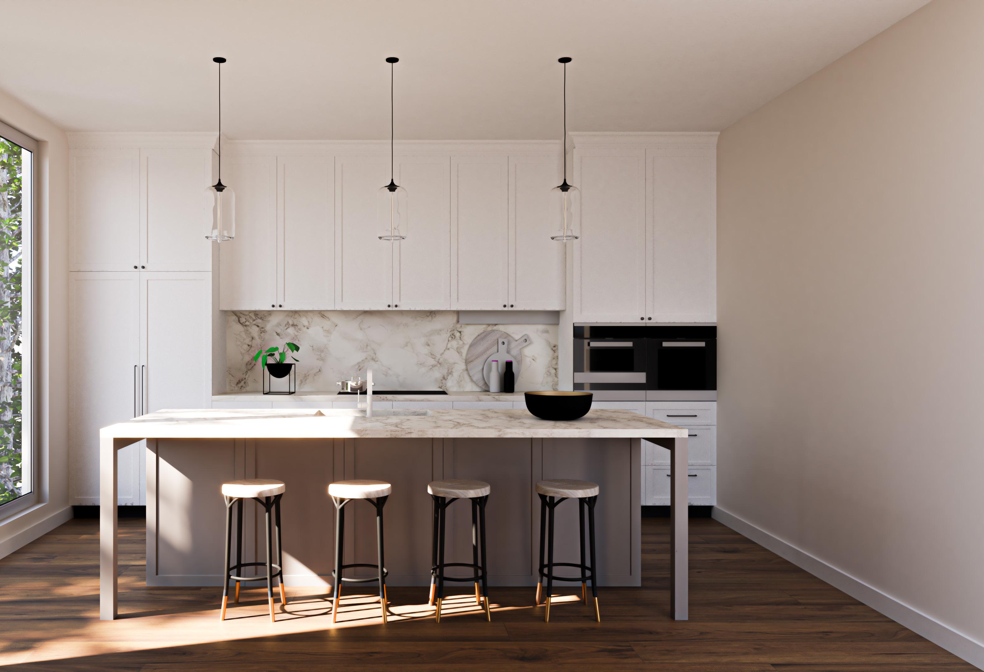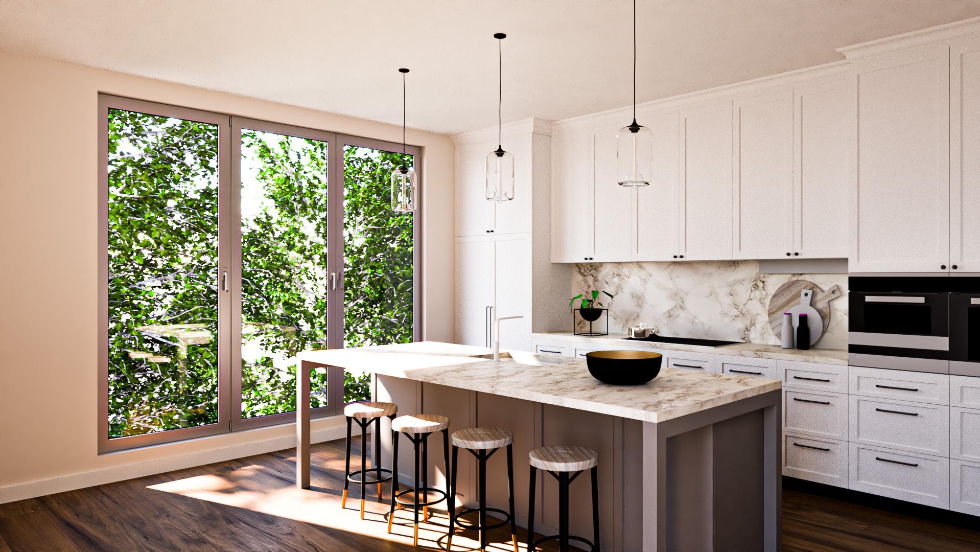 This kitchen design exudes modern elegance with a warm and inviting touch. The expansive glass doors allow an abundance of natural light to flood the space, creating an open and airy atmosphere. The seamless white cabinetry extends all the way to the ceiling, offering both a sleek aesthetic and ample storage. A marble backsplash adds a sense of luxury, tying in beautifully with the island’s marble countertop. The island itself serves as both a functional workspace and a gathering spot, complemented by stylish barstools with gold accents that bring a hint of sophistication. Hanging pendant lights add just the right amount of refinement, blending effortlessly with the overall minimalist yet warm design.