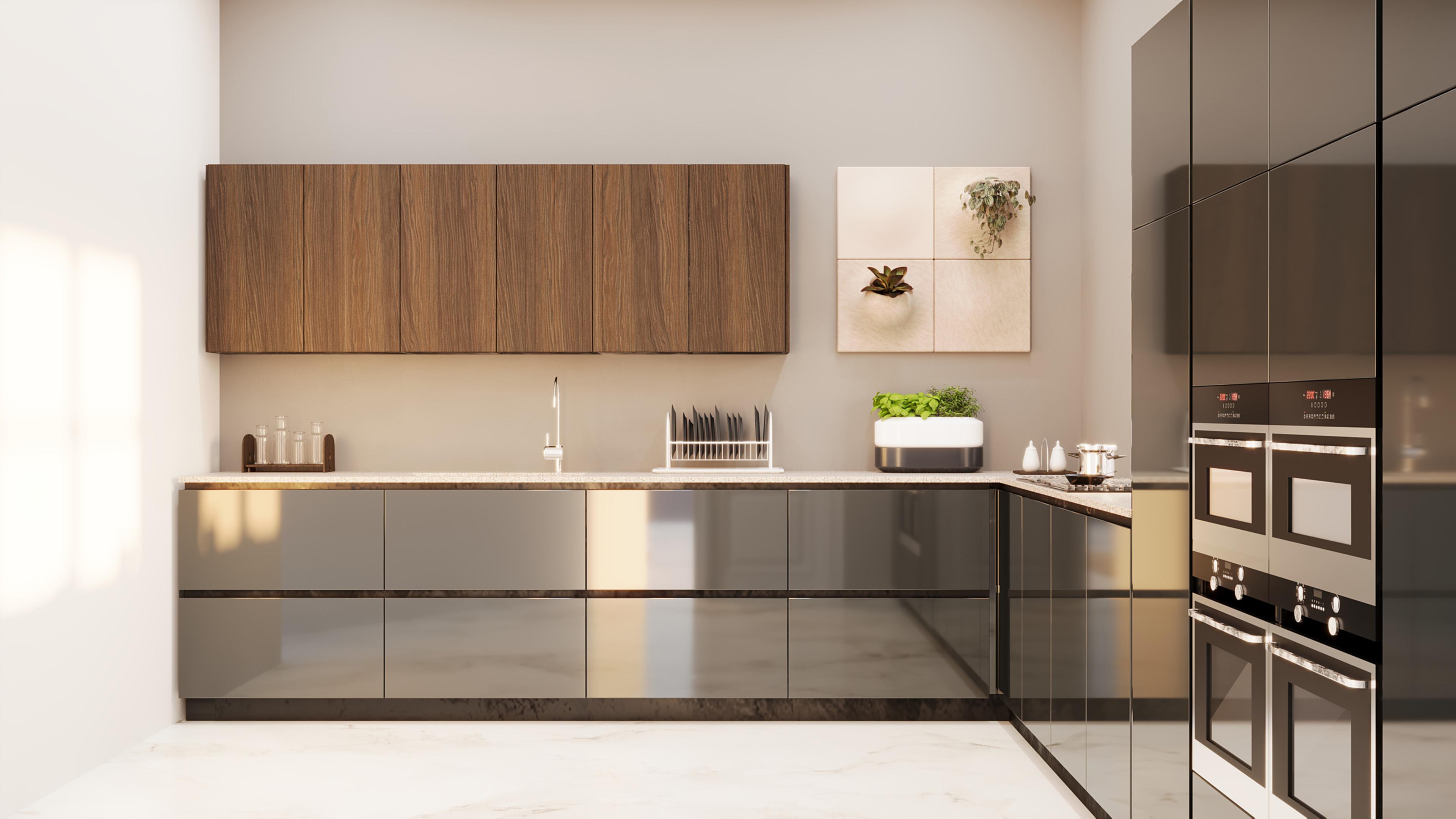 This kitchen design embodies modern sophistication with its sleek black gloss cabinetry contrasted by warm wooden overhead units. The L-shaped layout maximizes functionality, providing ample counter space for cooking and meal prep.