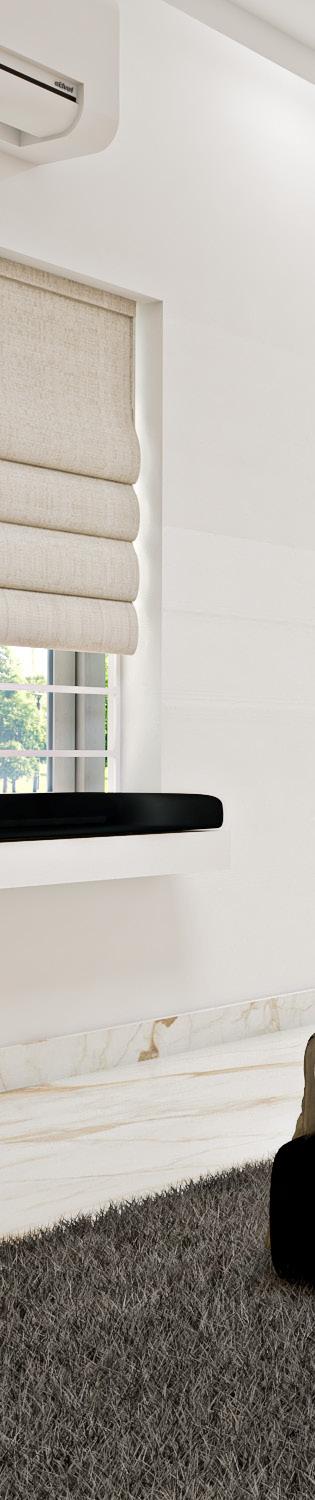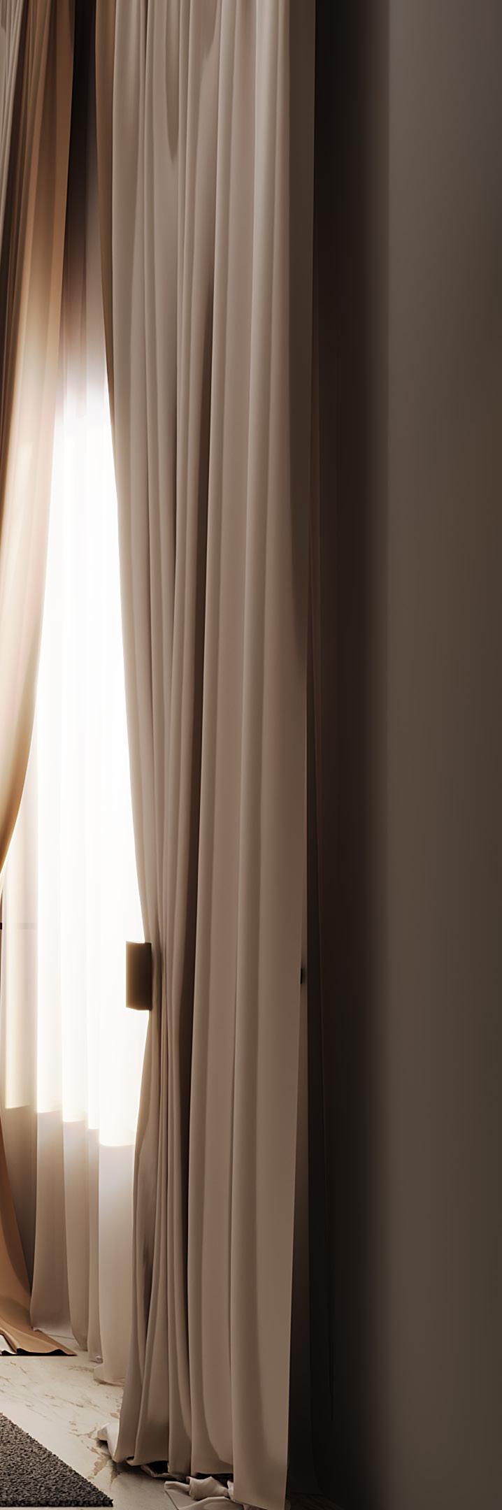 This living room exudes a perfect blend of modern elegance and cozy comfort. The deep green sectional sofa serves as the focal point, adding richness and depth to the neutral-toned space. A mix of textured and patterned throw pillows enhances the inviting ambiance, while the sleek, contemporary coffee table provides both functionality and style. The soft, flowing curtains frame the large windows, allowing warm natural light to filter in, creating a serene atmosphere. A wellplaced indoor plant brings a touch of nature indoors, complementing the earthy tones of the space. The vertical paneling on the walls, along with the minimalist shelving and décor accents, adds subtle sophistication. The wall-mounted TV seamlessly integrates into the design, making this living area both aesthetically pleasing and practical for everyday use.