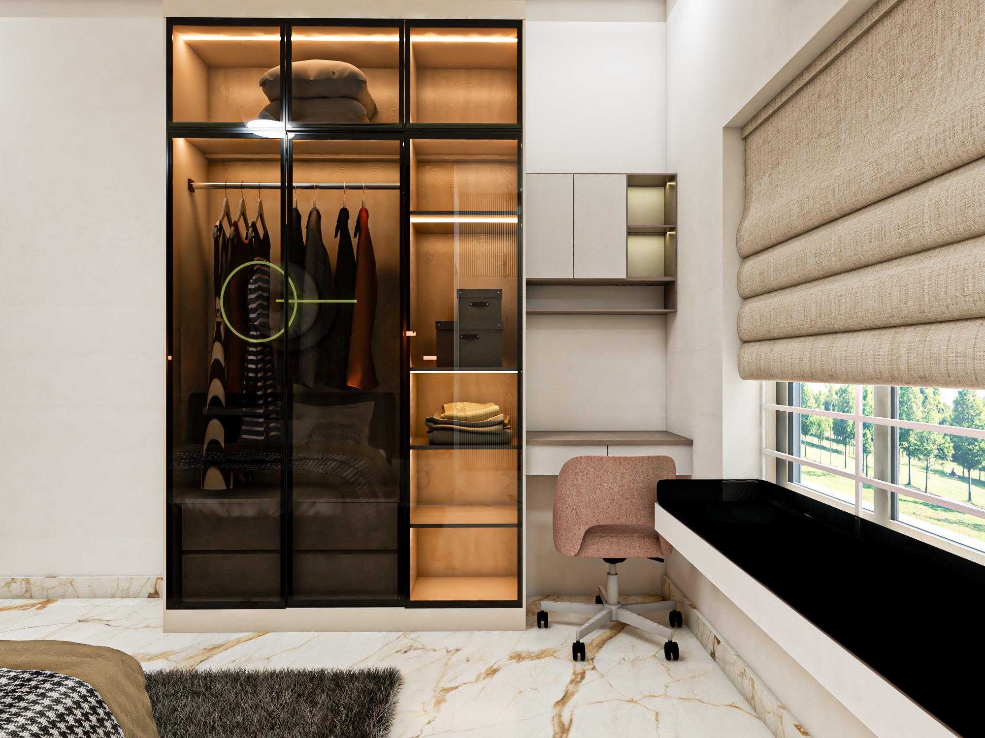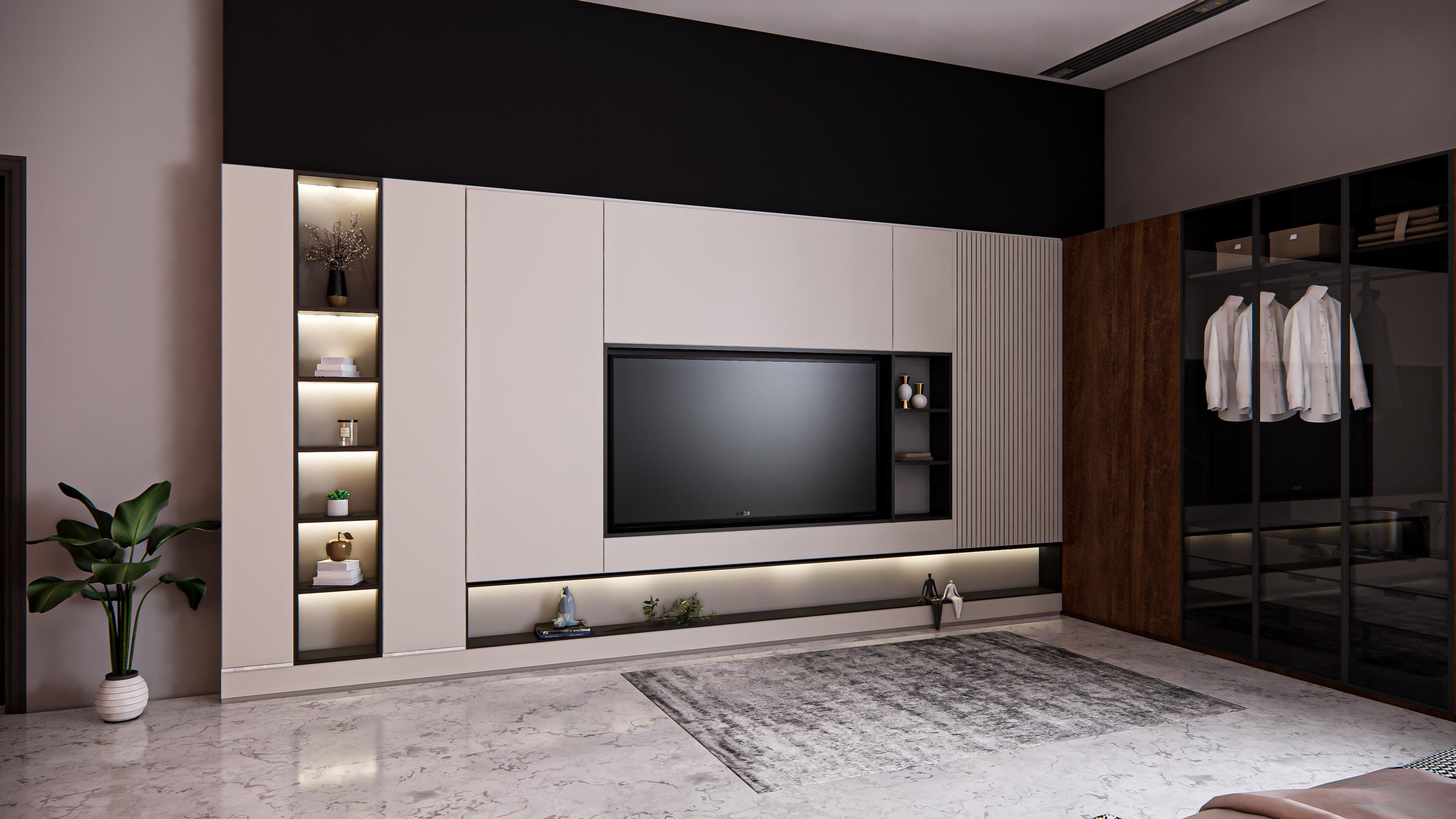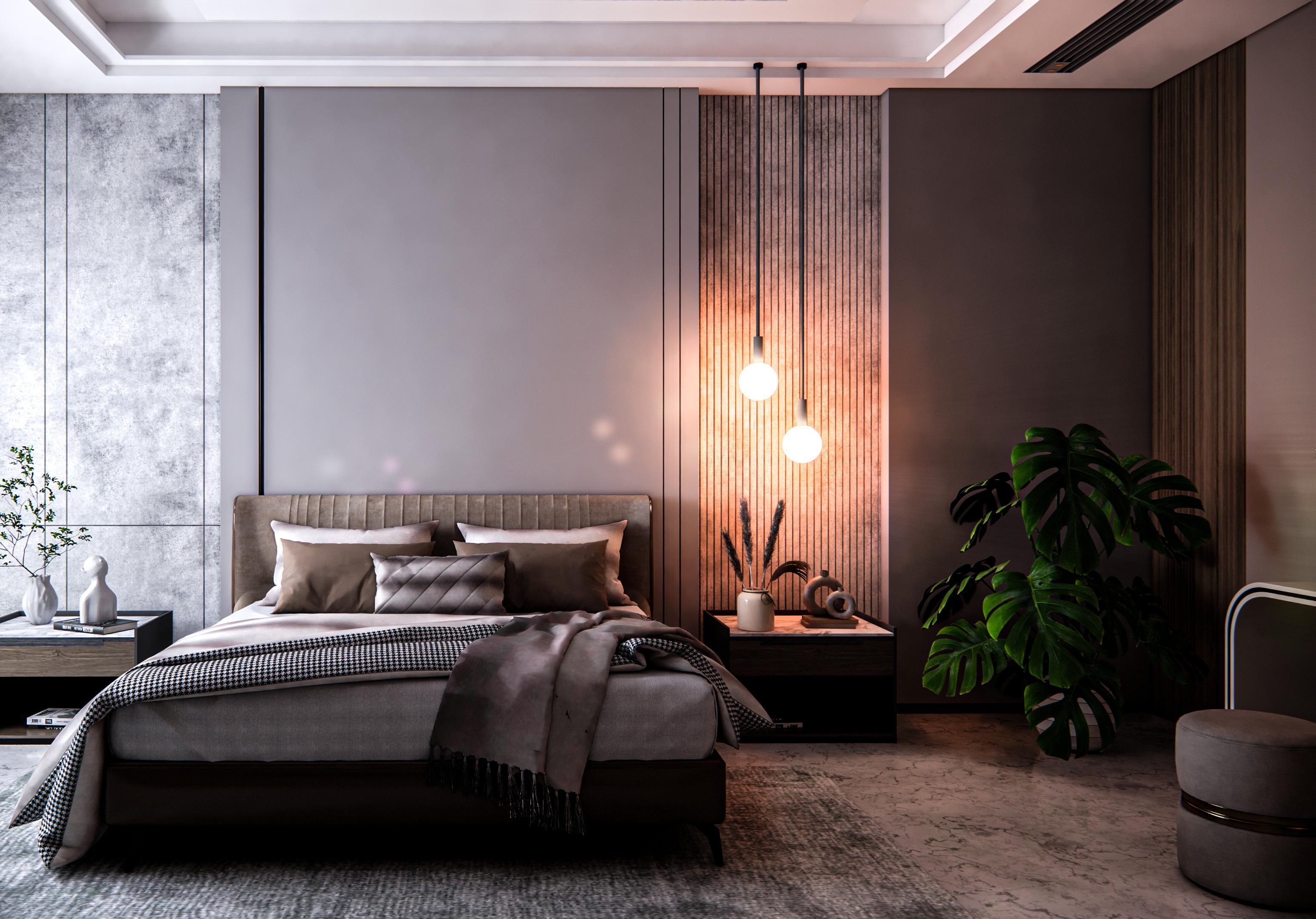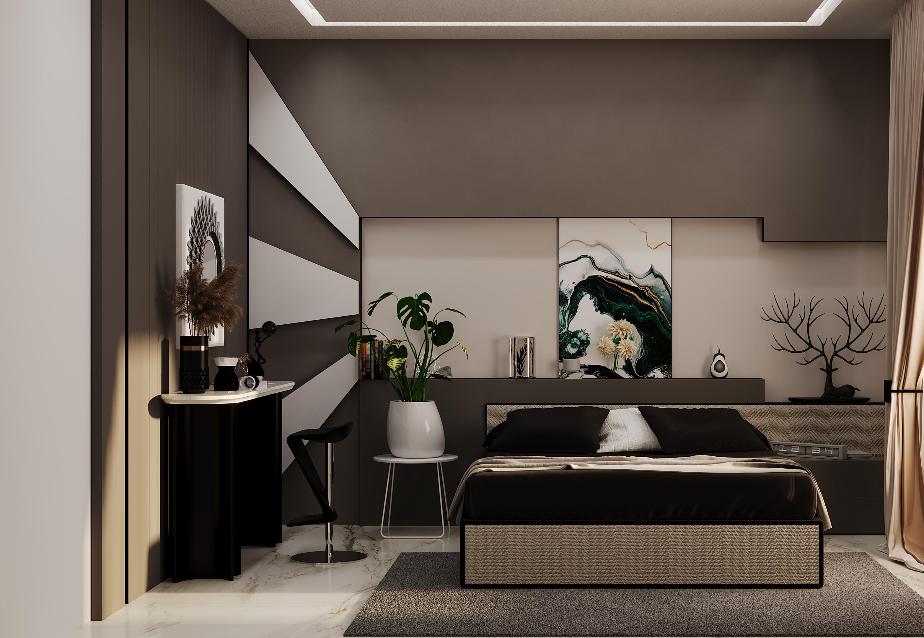 This bedroom design captures the essence of modern minimalism, blending clean lines with an elegant and understated aesthetic. The muted color palette, dominated by earthy tones, black, and white, establishes a calming atmosphere while maintaining sophistication. The geometric wall patterns create visual interest and depth, serving as a focal point without overwhelming the space. Natural elements, such as the greenery and textured materials, add warmth and a sense of balance to the contemporary setting. Every element in the room, from the artwork to the decor, is thoughtfully placed to harmonize functionality with style. The soft, layered lighting further enhances the cozy ambiance, making the space both inviting and practical. This design celebrates simplicity with a refined and luxurious touch. SOFTWARE - 3Ds