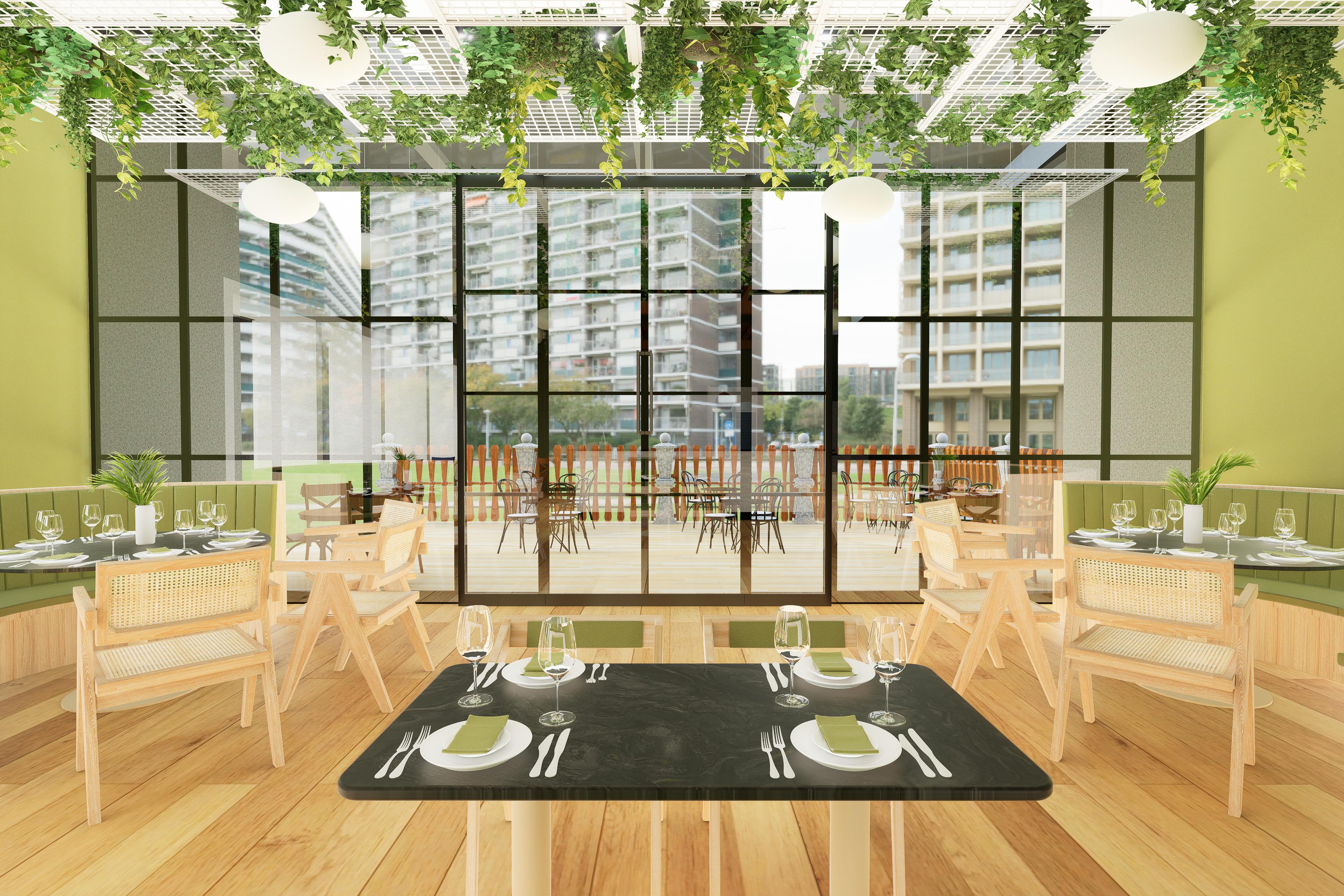 This café design has a warm and inviting ambiance with earthy tones and natural materials. The combination of a green accent wall, wooden ceiling beams, and soft lighting creates a cozy and organic feel.