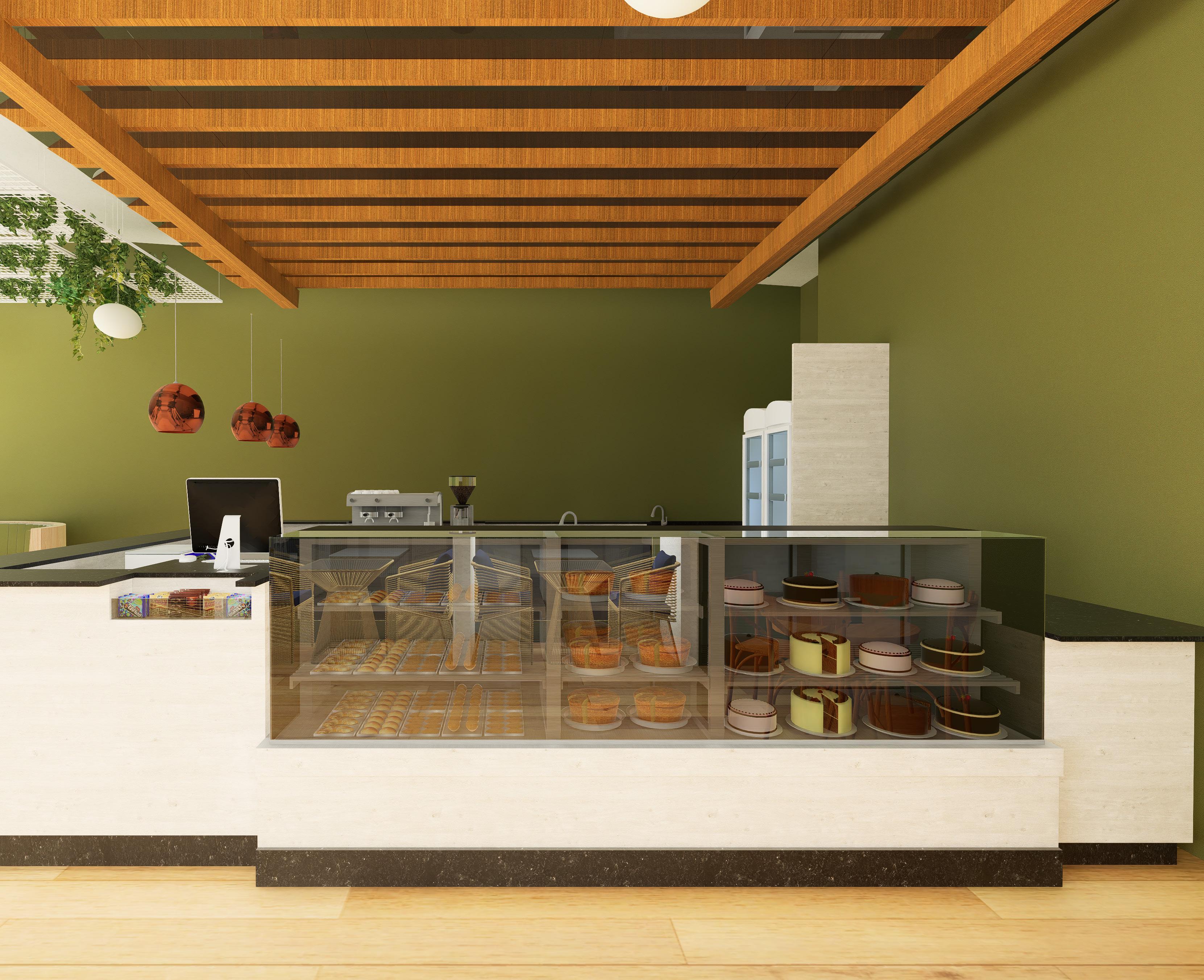 The display counter is well-organized, showcasing fresh baked goods and cakes in a visually appealing way. The use of glass for the display adds transparency and cleanliness, while the beige and black countertop complements the overall aesthetic. The copper pendant lights add a touch of elegance and warmth to the space.