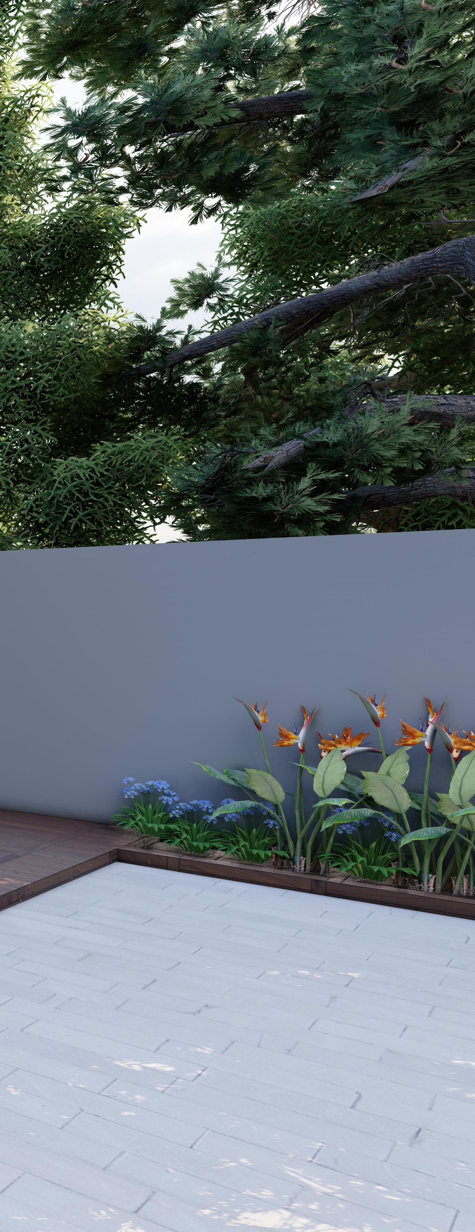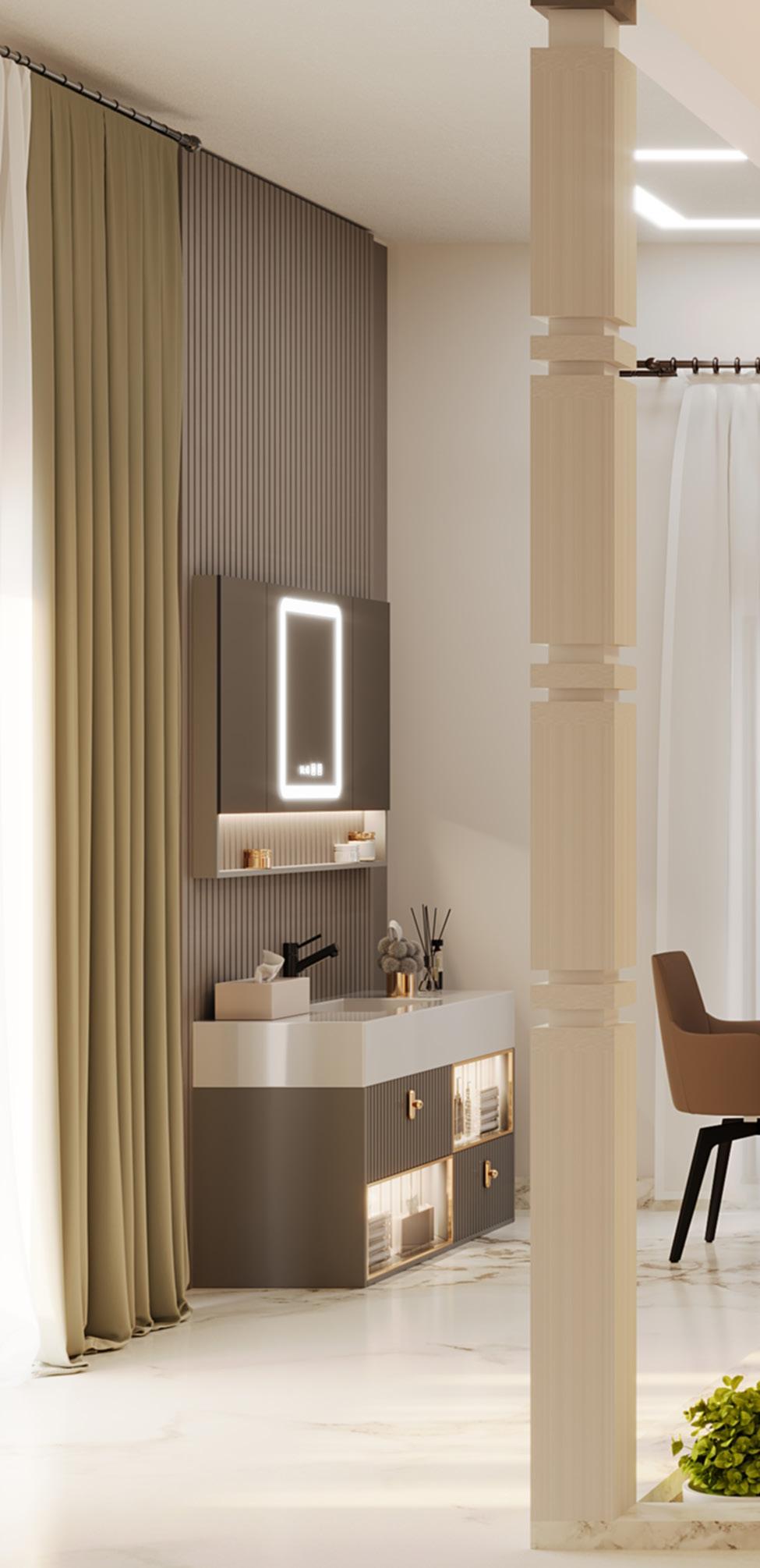 This courtyard design is a serene integration of modern architecture with natural elements, creating a calming focal point within the home. The open and airy layout allows natural light to flood the space, emphasizing the vibrancy of the central bonsai tree, which stands as a symbol of elegance and balance. Surrounded by neatly arranged greenery and stepping stones, the design promotes harmony and tranquility. The marble flooring and minimalist finishes enhance the luxurious yet understated appeal, while the warm, concealed lighting adds depth and coziness. This courtyard blends functionality with aesthetics, making it a perfect retreat within a contemporary home.