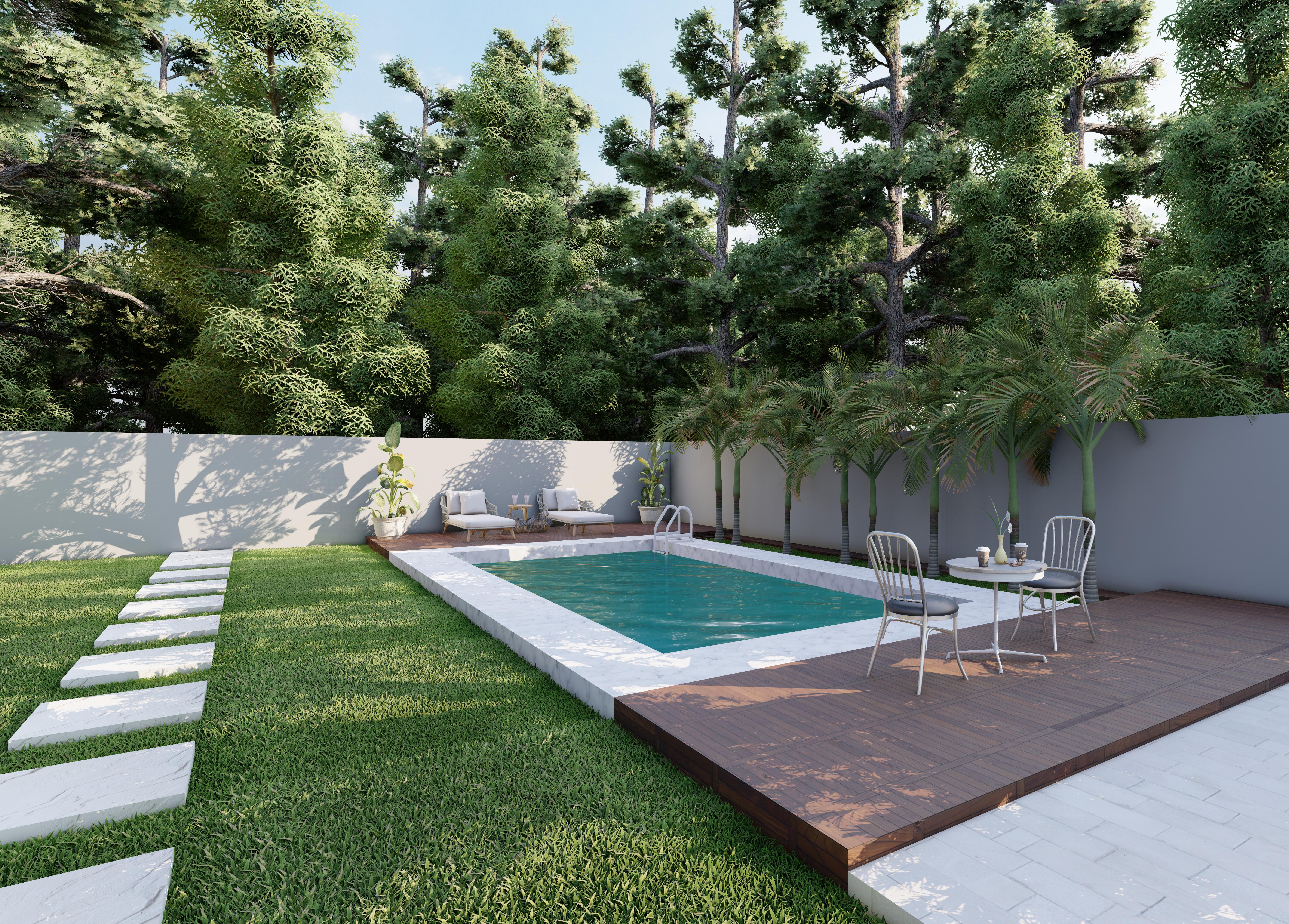 To the right, a beautifully integrated outdoor space includes a stylish seating area by the pool, offering a luxurious yet cozy ambiance for relaxation and entertainment. The lush greenery surrounding the property enhances privacy and blends harmoniously with nature.