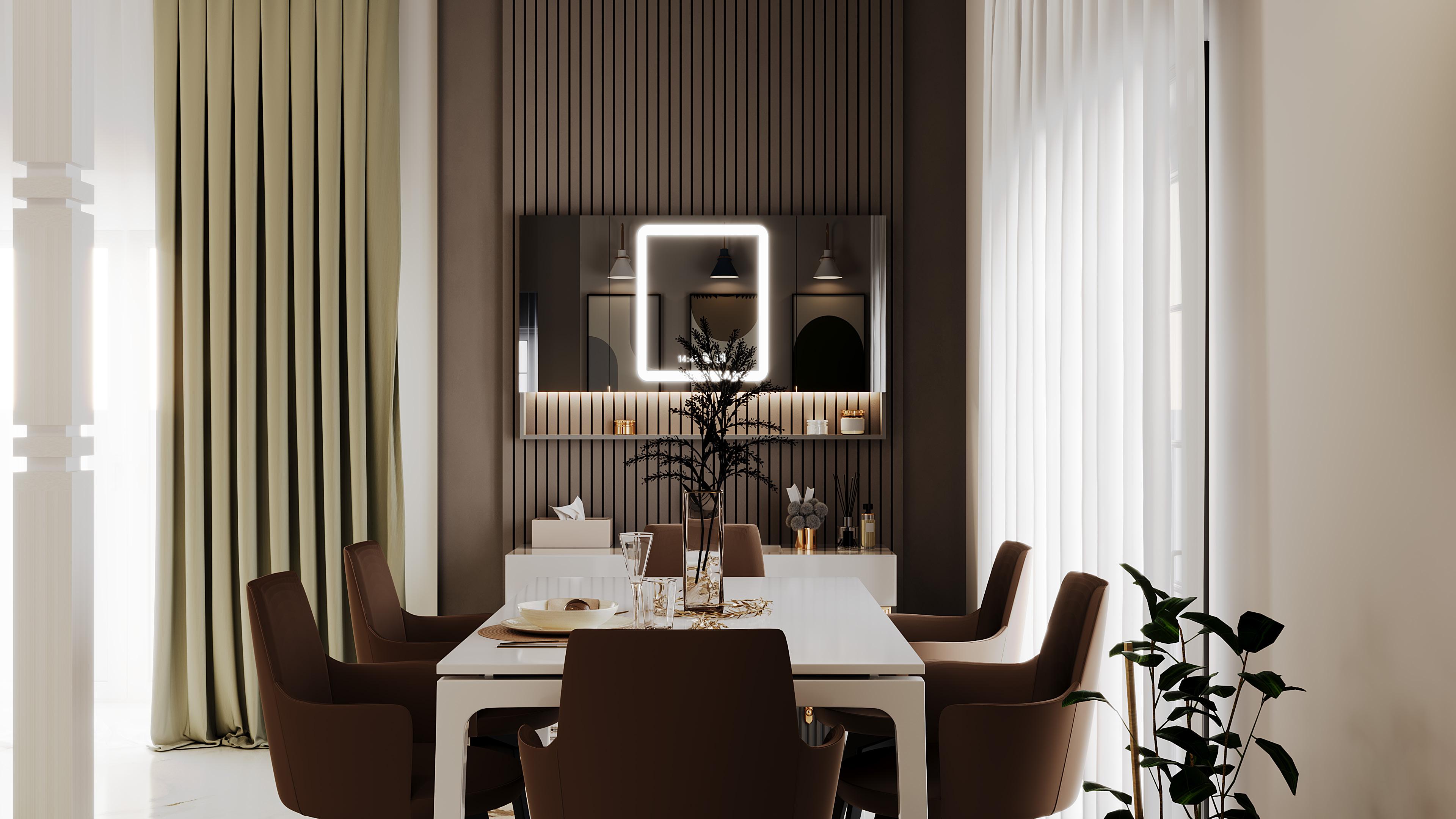 This dining space is a harmonious blend of simplicity and elegance, designed to foster a warm and inviting atmosphere. The clean, white dining table acts as the centerpiece, complemented by comfortable, neutral-toned chairs that add a touch of modern sophistication. The backdrop features abstract wall art in earthy and muted tones, creating visual interest while maintaining a minimalistic aesthetic. Soft natural light filters through the sheer curtains, enhancing the airy and open feel of the room. Subtle greenery and a minimal centerpiece bring life to the space, while the pendant lights above provide functional and ambient lighting. This dining area perfectly balances form and function, making it ideal for both everyday meals and intimate gatherings.
