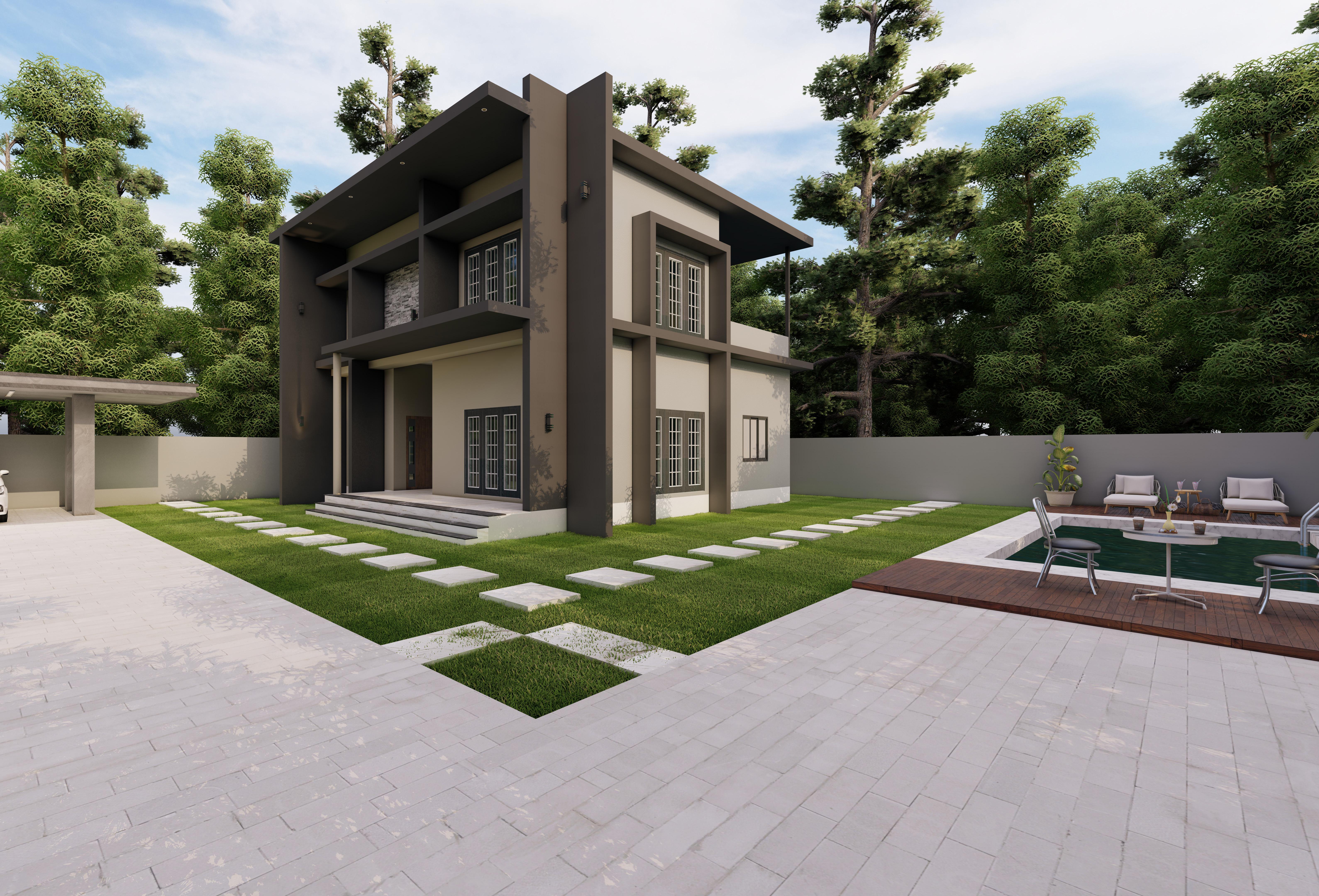 This exterior design showcases a perfect blend of modern elegance and functionality. The contemporary two-story structure features a balanced mix of neutral tones, with a combination of light beige and dark grey, adding depth and sophistication to the façade. The clean lines, geometric forms, and strategically placed windows enhance the overall architectural appeal.