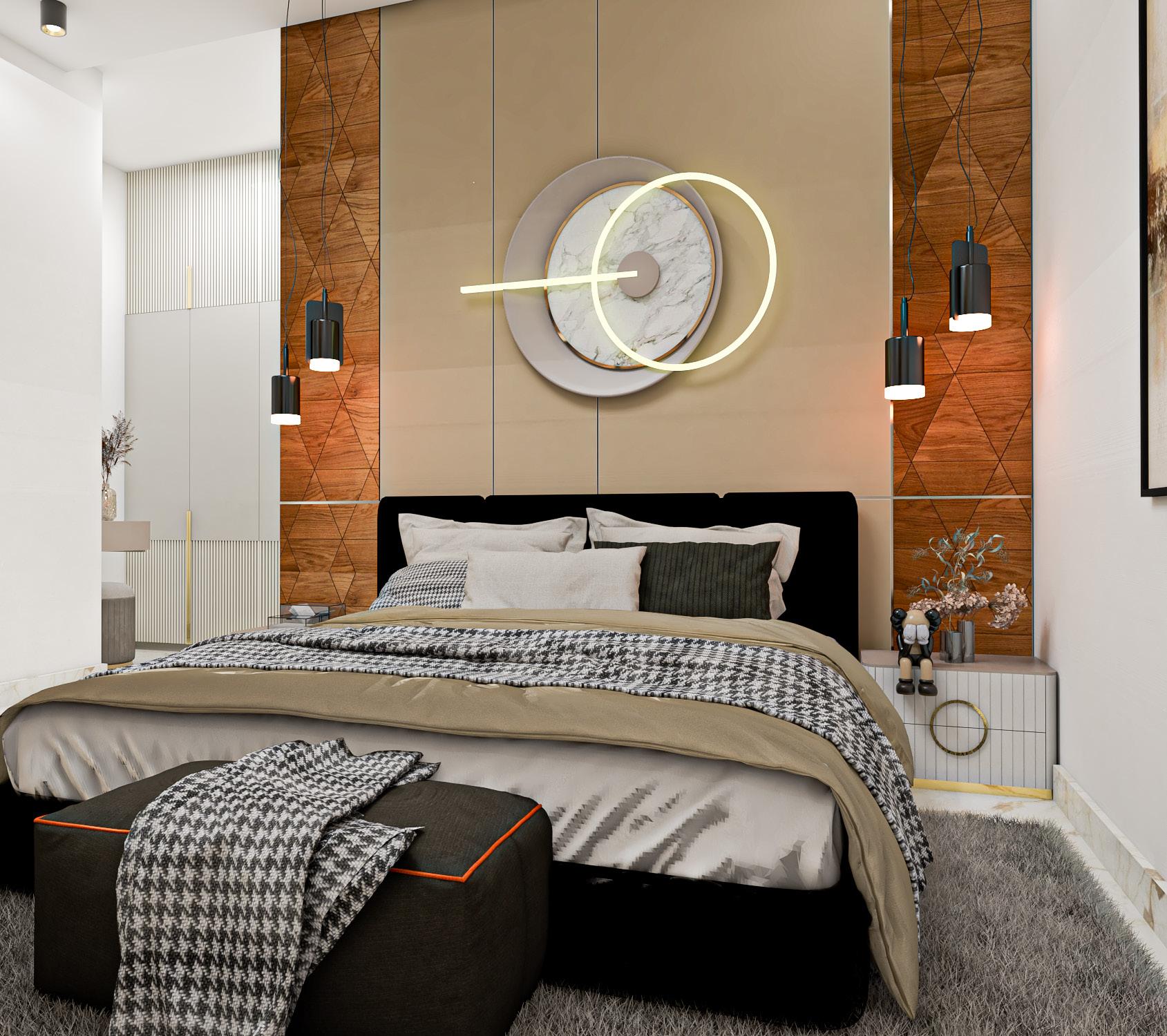 The feature wall behind the bed is a standout element, combining warm wooden panels with sleek beige panels, bringing an elegant mix of materials. A sculptural circular light fixture with a marble accent becomes a focal point, exuding a contemporary yet artistic vibe. The use of pendant lighting on either side of the bed provides a stylish and functional touch, complementing the verticality of the wooden wall panels.