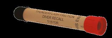 The Thunder Flash Friction Diver Recall is a pyrotechnic signal for communication with divers to surface or return to the support vessel. It can be utilised as a training aid where the simulation of a small explosive charge is required, as well as used as a Diver Recall signal. The igniter will cause the safety fuse to burn. A pyrotechnic composition is ignited resulting in a bright flash and a loud report. It has no harmful fragmentation and can be used on water. The S161DR has a striker attached and the minimum safety distance is 10 meters on land.