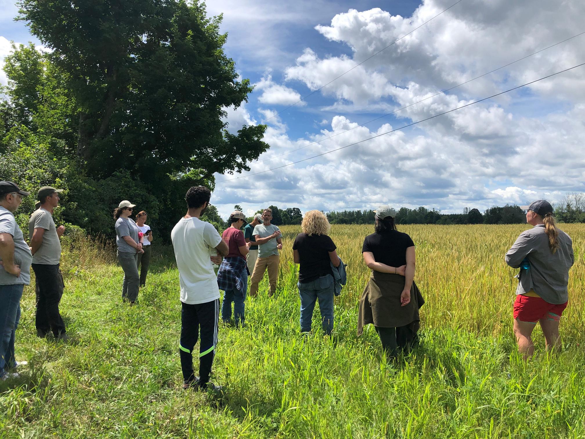 Diversified grain farmer, Chris Wooding, leading a farmer field day on his farm and grain demonstration site, Ironwood Organics, in Ontario.