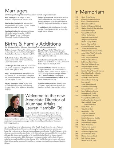 Births & Family Additions The Wesleyan College Alumnae Association extends congratulations to: Barbara Summers Blevins ’93 and Cameron of Knoxville, TN, on the birth of a daughter, Anna Kathryn Blevins, on October 24, 2009. Rachel Viets Fortuna ’97 and Kenneth of Macon, on the birth of their second child, Caleb, in December 2009. Lisa Bridges Hines ’98 and Casey of Norcross, GA, on the adoption of a daughter, Rebecca Judith, born April 22, 2010. Amy-Chris Vinson Smith ’99 and Jonathan of Charlotte, NC, on the birth of a daughter and future Wesleyanne, Jordan Ellison Smith “Jes” on August 18, 2010. Nartaya Jumpasorn Miller ’98 and Ryan of Chula Vista, CA, on the birth of a son, Grayson “Gray” Tyler Miller, on November 20, 2009.