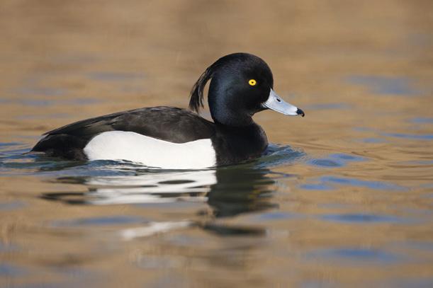 Diving ducks, like the tufted duck, dive underwater for food. Tufted ducks are easy to spot. Males have striking black and white feathers and a funky head tuft, while females are browner with a smaller tuft. Another winter star is the pochard: males have a pale grey body, chestnut head, and red eyes; females are mostly grey-brown.