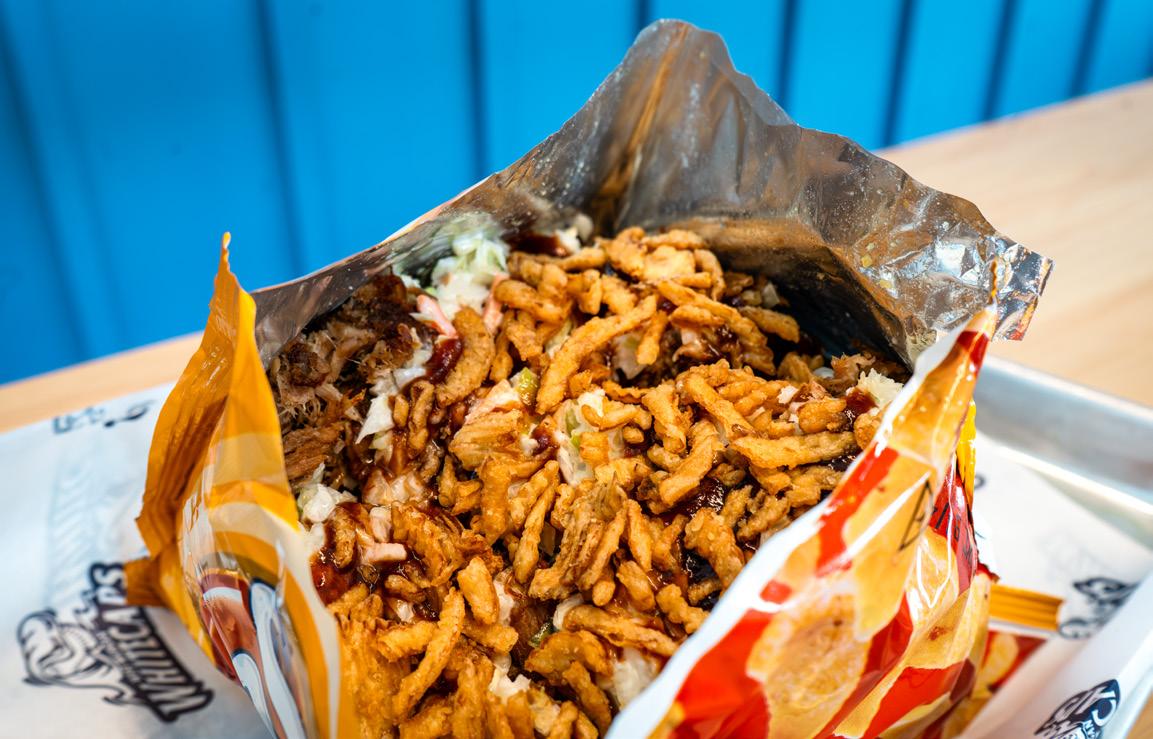 Our 2025 FAN FOOD VOTE WINNER, submitted by ASHLEY PERKINS, is a SOUTHERNLY TWISTED WALKING TACO: A BAG OF CORN CHIPS BURSTING AT THE SEAMS, FILLED WITH PULLED PORK, COLE SLAW, CRISPY FRIED ONIONS, AND SMOTHERED IN BBQ SAUCE!