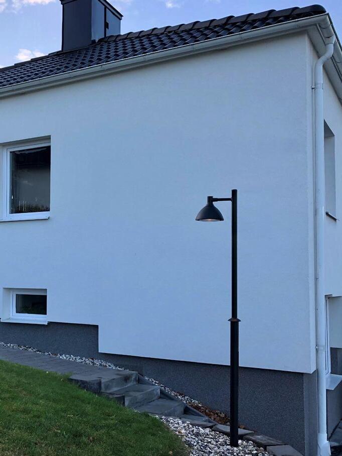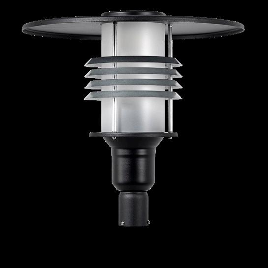 Stolparmatur med rotationssymmetrisk ljusbild. Varmgalvaniserad alt. pulverlackerad stomme, diffuserad med bländskydd i frostad akryl. Passar för bruk både i privat och offentlig miljö.