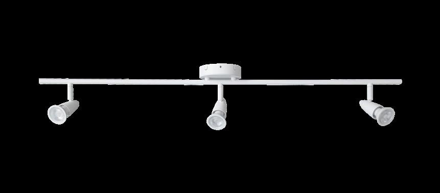 Dimbar takarmatur i pulverlackad aluminium med tre justerbara spotlights. Levereras inkl. GU10 ljuskälla. installeras enkelt med takbygel i tak eller över takdosa.