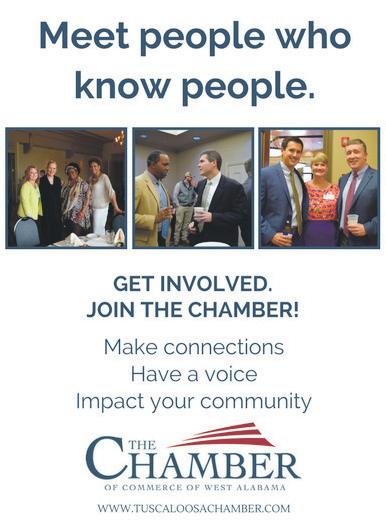 On behalf of the dynamic membership of the Chamber of Commerce of West Alabama, I’d like to welcome you to the Tuscaloosa County area. Here, you’ll nd progressive growth combined with the friendliness and charm of a small Southern community.