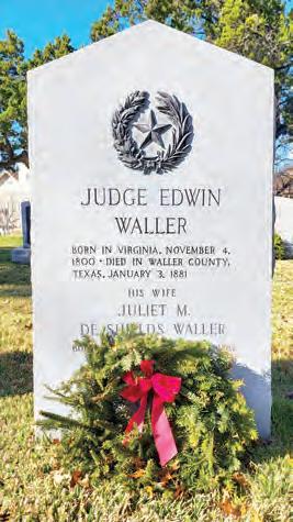 the Articles of Secession from the United States immediately after the president of the convention. We all know how that attempt to form yet another new nation turned out for Texas and the South. In 1873, in his honor, Waller County was created out of Austin and Grimes Counties. By then, the veterans of the Texas Revolution were being recognized, and Edwin Waller was the first president of the Texas Veterans Association. When he died in Austin on January 3, 1881, he was busy compiling names of the veterans. He was buried in the family cemetery in Waller County. However, in 1928, in recognition of his prominence in Texas history, his remains and those of his wife were reinterred in the State Cemetery in Austin. You can see his gravestone today on Patriot Hill. Let us salute Edwin Waller, feisty patriot of Texas.
