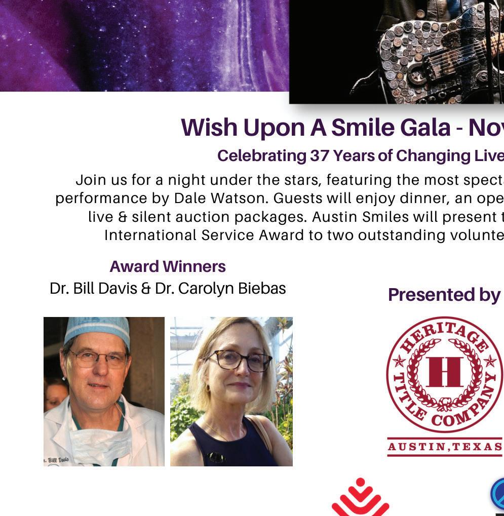 The gala takes on special significance this year, as Austin Smiles awards the 5th Annual Cullington, Fox, Beckham International Service Award to Dr. Bill Davis and Dr. Carolyn Biebas.