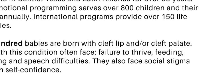 800 children benefit from Austin Smiles social-emotional support yearly; the team conducts 3 Latin American medical missions, performing 150 life-changing surgeries annually.