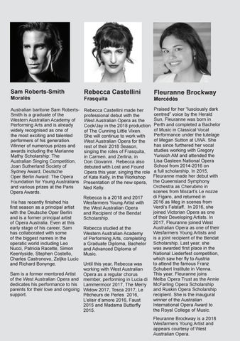 Until this year, Rebecca was working with West Australian Sam is a former mentored Artist Opera as a regular chorus of the West Australian Opera and member, performing in Lucia di dedicates his performance to his Lammermoor 2017, The Merry parents for their love and ongoing Widow 2017, Tosca 2017, Le support. Pêcheurs de Perles 2016, L’elisir d’amore 2016, Faust 2015 and Madama Butterfly 2015.