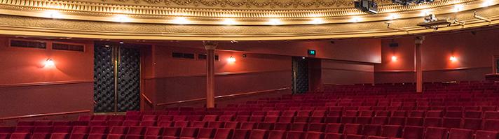 Photo shows rows of red velvet seats in the stalls of His Majesty’s Theatre. Golden lights from the balcony shine above.
