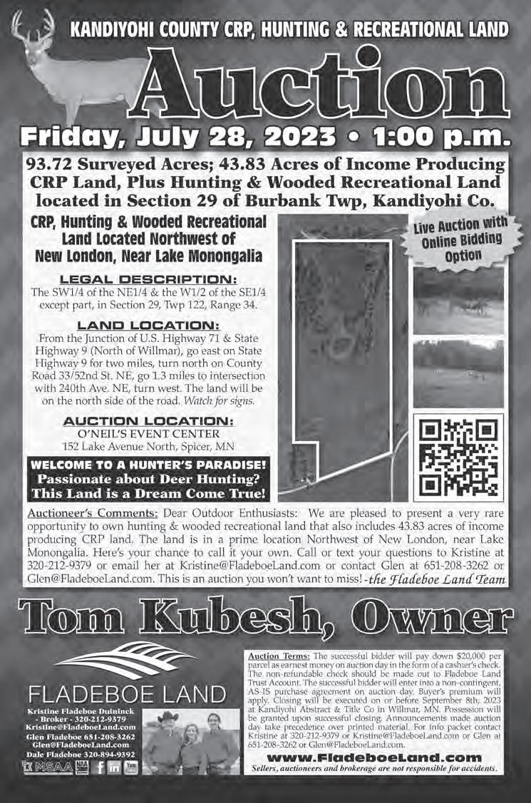 AuctionTerms: Thesuccessful bidder(s)wil lpay down $25,000 per parcel asearnestmoney on auctionday intheformofa cashier’scheck.The nonfundabl heck sh ld be de ttoFladeboeL dT st Ac t. All partieswil lneedtopreregisterand agreetoauction termsprior to biddingon theonlineauction.The successfu lbidder(s) wi ll enterintoanon-contingent, AS -ISp ch gr nt ctionday.Buy ’s pr iu il lapply.Final pric il lb al latedbythe mb of deeded sp th y. Closingwil lbeexecutedonorbefore September27th, 2023,withattorney Brad Schmidt, inWi ll mar, MN.Officia lauction termstakeprecedenceover printedand rketingmat ia l. To register, nt tGlenat651-208 -3262 emai lGlen@FladeboeL d. tact Kristi at 320-21 2-9379 ai l Kristine@FladeboeLand.com. www.FladeboeLand.com Sellers,auctioneersandbrokeragearenotresponsibleforaccidents.
