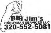 GENERAL Now Seeking Custom A pplicator s Fulland Parttime positionsavailable Experience is aplus- but not necessary Acomplete benefit packageis available forfull time positions. Applications can beobtained by visiting montevideocenex.com or by callin g 320-269-8861 Montevideo-GraniteFallsCo-op 124 W. Nichols Ave. Montevideo MN 56265 Montevideo-GraniteFallsCo-op isa strongand establishedlocalcooperative servingtheMontevideo and Granite Falls, Montevideo- Granite FallsCo-op DIRECTORY SERVICE YOUR GUIDE TO GREAT SERVICES! CONSTRUCTION GUTTERS HANDYMAN LAWN CARE PAINTING SMALL ENGINE CARPET CLEANING HOUSEKEEPING MECHANIC ELECTRICAL AND MORE! DIRECTORY SERVICE YOUR GUIDE TO GREAT SERVICES! CONSTRUCTION GUTTERS HANDYMAN LAWN CARE PAINTING SMALL ENGINE CARPET CLEANING HOUSEKEEPING MECHANIC ELECTRICAL AND MORE! 888-857-1920 or classifieds@classifiedsfcc.com for details. HANDYMAN No job too big or too small! •Siding Repair •Exterior Painting/Staining •Refurbished Decks •Window Repair/Installation •Drywall Repair HEATING/ AIR CONDITIONING Heating & Cooling By Sam Furnaces, AC, in-floor heat, boilers, garage heaters & duct work. 214-9562 MISCELLANEOUS SERVICES WATER SOFTENER REPAIR Service on ALL brands! Call Dale 320-796-6020 MISCELLANEOUS SERVICES Ms. Kay’s Services LLC Professional Cleaning Commercial and Residential Call for a free estimate 320-212-6126 PLUMBING Sales & Service Drain Cleaning 24 Hr. Emergency Service Furnace & A/C Repair & Replacement Trenchless Sewer Replacement (320) 354-2281 NEW LONDON, MN PLUMBING * Heating Air Conditioning * Drains TREE SERVICE/ STUMP REMOVAL HURLEY’S TREE SERVICE Tree trimming and removal. Free estimate. Insured. 320-995-1426. Tree Cutting Branch Removal Experienced & Reliable Free Estimates 320-894-5246 MISCELLANEOUS SERVICES MISCELLANEOUS SERVICES Call Kurt at 320-894-4956 Insured • Lic# BC680736 RESIDENTIAL REMODELING INTERIOR & EXTERIOR FINISHING • Siding • Windows & Doors • Soffit & Fascia • Basement Finish • Decks • Remodeling & MORE! LANDSCAPING/ GARDEN LANDSCAPING/ GARDEN HILLENBRAND LANDSCAPING Landscape Contractor | Residential & Commercial • Pavers • Shore Restoration • Trees • Shrubs • Rock • Mulch We are a design to installation contractor Call Gary Today! 320-905-0655 MISCELLANEOUS SERVICES MISCELLANEOUS SERVICES MISCELLANEOUS SERVICES MISCELLANEOUS SERVICES AUTHORIZED DEALER for Docks and Boatlifts (320)-796-5481 Tree Work • Stump Grinding Lawn Care • Land Scaping Sprinkler Systems • Pressure Washing Shoreline Renovation Mowing-Thatching-Core Aeration • Weed & Feed Landscaping A to Z • Tree & Stump Removal Mobile Pressure Washing • Dock & Lift Installs Shoreline Renovation & Rip-Rap