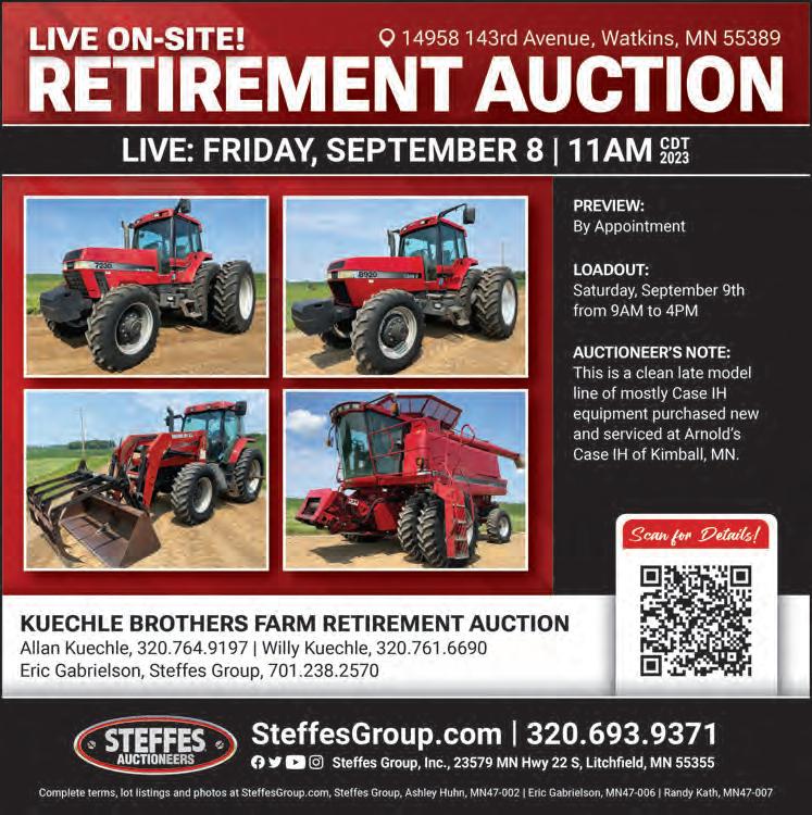 PUBLISHED BY THE WEST CENTRAL TRIBUNE REACH 15,200 READERS WEEKLY! VOLUME 91 NO 36 SUNday, SEptEMbEr 3, 2023 WILLMar, MN 56201 PRST STD U.S. POSTAGE PAID WILLMAR MN PERMIT NO. 17 JOIN OUR TEAM APPLY ONLINE TODAY! COMPETITIVE WAGES | PAID TIME OFF FULL BENEFITS | 401K dooleypetro.com/careers Go to Fladeboeland.com for details & drone videos SEPTEMBER FARMLAND AUCTIONS For more information contact Kristine at 320-212-9379 Glen Fladeboe 651-208-3262 Dale Fladeboe 320-894-9392 THINKING OF SELLING YOUR FARMLAND? NOW IS A GREAT TIME TO PLAN YOUR AUCTION OR PRIVATE SALE! Fladeboe Land has been in business for 45 years and is a leader in Farmland Auctions and Sales throughout Minnesota. We know farmland sale pricing and we will help you determine what your land is worth and the best way to sell it. AUCTION –EASTLUND FARM –Julie& JimHonzay, Ow ners Auctioneer ’s Note: We arepleasedtopresent theEastlundFarmfor sale by auction This land has been proudlyowned by theEastlundFamilysince 1897.Thishighquality farmland hasanimpressiveCPI of 94.7.Ithas aprime location just southofthe intersection of Highway71 &Highway 7nearBlomkest. This farm offers138.08+/- tillable acres, 12+/-acres of possible pastureand is locatedinRoseland To ship,inKandiyohi County.Possessio ill be afterthe 2023harvest andsuccessfulclosing.Here is yo opport itytoadd primetillable stoy rf ming op ationori tm tp tfolio Youwill notwanttomissthisauction!Call or text Kristine with anyquestions youmay have at 320-212-9379 or email heratKristine@FladeboeLand.com AuctionTerms Thesuccessfulbidderwillpay down$75,000 as tm ey tiondayinthe fo of hi ’s ch k. Th fundable ch kshouldbemad ut to Fladeb Land Tr t Account. Thesuccessful bidder will enterintoanon-contingent AS-ISpurchase agreementonauctionday. Buyer’spremium will apply. Fi lpri will be lculated by th berofd deda perthe ey.Closing will be uted befo Octobe 30th,2023, with attorney SpencerKvaminGranite Falls, MN. Announcementsmadeauctiondaytakeprecedence over printed terial.F info packet ll Kristi at 320-212-9379 orby ailt Kristi @FladeboeL d. www.FladeboeLand.com Sellers,auctioneersandbrokeragearenotresponsibleforaccidents. LEGALDESCRIPTION: TheNortheast Quarter except building site Section26, Township 117, Range 35 LANDLOCATION: From theintersectionofHwy 71 &Hwy 7, take Hwy71South 1mileto210th AveSE (CoRD78),goeaston210th AveSE(Co Rd 78)0.5 milestothe NW corner of theland. Watchfor signsonthe southsideofthe road. AUCTIONLOCATION: BLOMKEST COMMUNITY CENTER 103MainStreet, Blomkest,MN •ThisLand HasTile •CPI =94.7(Tillable Acres) •Prime Location in Roseland Twp. •Land WasNotUsed forSugar Beet Production KristineFladeboeDuininck -Broker -320-212-9379 Kristine@FladeboeLand.com GlenFladeboe651-208-3262 Glen@FladeboeLand.com DaleFladeboe320-894-9392 PRIMEFARMLANDINK ANDIYOHI COUNTY Monday,September 18,2023•11:00 a.m. 157.01Surveyed Acres,138.08+/- Tillable (FSA)Acres,CPI=94.7, locatedinRoselandTownship, KandiyohiCount y. •157.01Sur veyedAcres •138.08+/- Tillable (FSA)Acres •CPI=94.7(Tillable Acres) •ThisLandHas Tile •LandWas NotUsedforSugar Beet Production i LiveAuctionwith OnlineBidding Option AUCTION CROONQ UIST TRUST Daniel &Shelley Croonquist,Sellers AuctionT Th fulbidde ill payd n$35,000 earnestmoney on auctiondayinthe form of acashier’s check. The non-refundable checkshouldbemadeout to FladeboeLandTrust Ac t. Th sful bidd will terint ting t, AS-ISp ch ag tona tionday. Buyer’sp miumwill apply. Fi lpri will be lcul ed by th berofd deda as perthe survey.Closing will be executed on or before November 9, 2023, with attorney Brad SchmidtinWillmar, MN.Announcements de in thebidding te spri to th ti take pr ed other printedmat ial. Forinfop ket ll Kristi at 320-212-9379 orby emailtoKristine@FladeboeLand.com www.FladeboeLand.com Sellers,auctioneersandbrokeragearenotresponsibleforaccidents. LEGALDESCRIPTION: Part of theN1/2 of theSW1/4,Section 15 Township 119, Range 34. •ThisFarmHas Tile &anExcellent Outlet •ThisLandHas Been Surveyed LANDLOCATION: From Kandiyohi: At theintersectionofHighway 12 &4th Street S(aka82ndStSE),gosouth on 4thSt S/82ndStreet