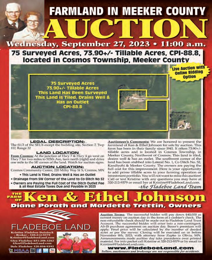 Kristine@FladeboeLand.com GlenFladeboe651-208-3262 Glen@FladeboeLand.com DaleFladeboe320-894-9392 75 Surveyed Acres, 73.9 0+/- Tillable Acres, CPI-88.8, locatedinCosmos Township,Meeker Count y ount LiveAuctionwith OnlineBidding Option 75 Surveyed Acres 73.9 0+/- Tillable Acres ThisLand HasBeen Surveyed ThisLandisTiled,DrainsWell& HasanOutle t CPI-88.8 LEGALDESCRIPTION: TheS1/2ofthe SE1/4exceptthebuilding site,Section 7, Twp 117, Range 32 LAND LOCATION From Cosmos: At thejunctionofHwy 7&Hwy 4goweston Hwy7for twomiles to 515thAve,turnnorth (right)and drive onemiletothe SE corner of theland. Watchfor auctionsigns AUCTIONLOCATION: Cosmos Community Center,220 MilkyWay St S, Cosmos,MN •ThisLandisTiled, Drains Well &Has an Outlet •Drainage from SW Corner of theLandtoCoDitch No 52 •Ownersare Paying theFull Cost of theDitch Outlet Fee &all Real Estate TaxesDue andPayable in 2023 Auctioneer ’s Comments: We arehonored to presentthe farmlandofKen &Ethel Johnsonfor sale by auction.This farm hasbeenintheir family since1941. It offers73.90+/tillable acresand is locatedinCosmosTownship, in Meeker County,Northwest of Cosmos.Thislandistiled drains well &has an outlet.The southwestcorner of the land hasbeenstubbed into LateralNo. 1, Co DitchNo.52 Kandiyohi&MeekerCounty. Theownersare paying the full cost forthisimprovement.Hereisyouropportunity to addprimetillable acrestoyourfarmingoperation or investment portfolio. Youwillnot want to miss this auction! Call or text Kristine with anyquestions youmay have at 320-212-9379 or emailher at Kristine@FladeboeLand.com. Wednesday, September 27,2023• 11:00a.m. AUCTION FA RMLA ND IN MEEKER COUNTY www.wctrib.com NEWS HOUND? www.wctrib.com